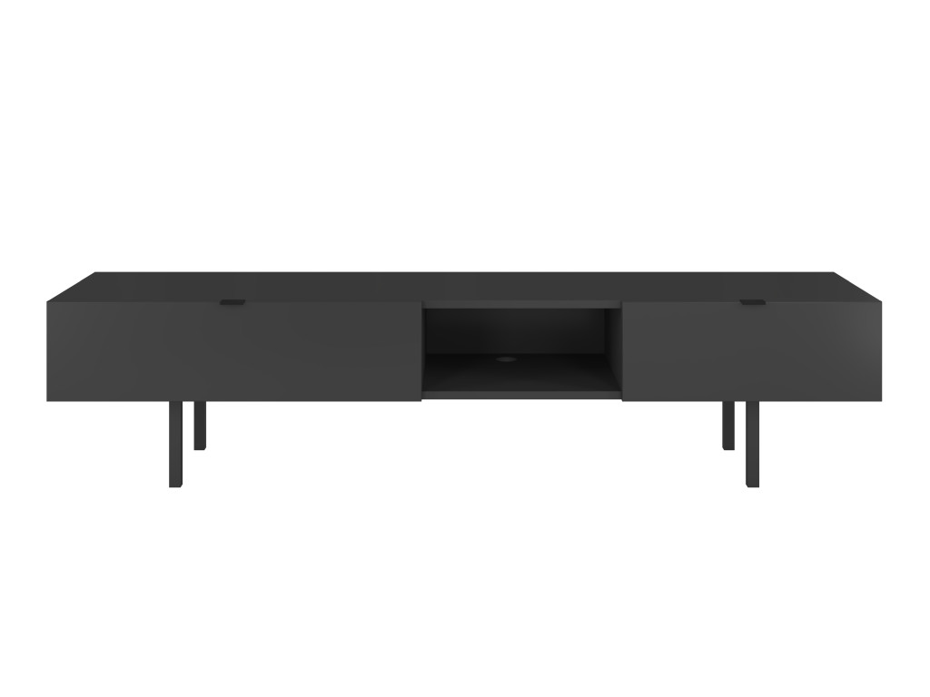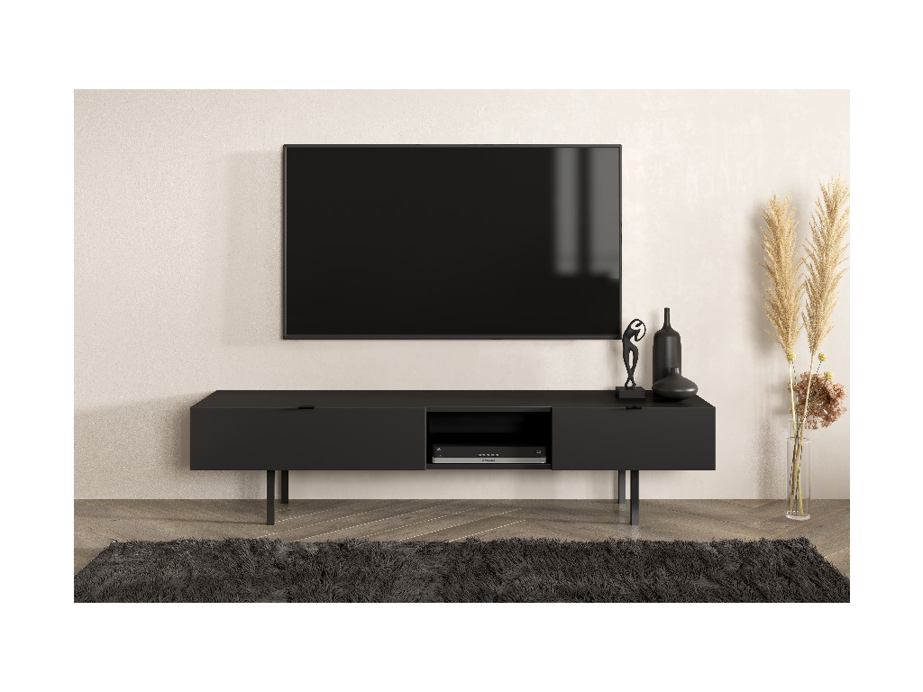 TV stolík MYWAY v modernom minimalistickom štýle spája eleganciu s funkčnosťou. Ponúka tri praktické úložné priestory – zásuvku, otvorenú a uzavretú policu, pričom diskrétne usporiada aj káble. Stolík je vyhotovený v čiernej polomatnej farbe a vybavený tichým zatváraním pre pohodlné, nehlučné používanie. Stabilitu zaisťuje päť čiernych kovových nôh vrátane jednej stredovej, ktoré navyše umožňujú jednoduchý prístup k priestoru pod stolíkom. Robustná nábytková doska zaručuje trvanlivosť, a univerzálny dizajn sa hodí do každého interiéru.