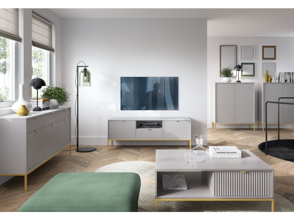 Elegantný TV stolík z kolekcie Novas je vhodný pre všetkých milovníkov moderného dizajnu. Predné drážkované časti sú doplnené o úchytky v zlatej farbe z hliníka. TV stolík stojí na čiernej konštrukcii, ktorá mu dodáva ľahkosť. Moderný a praktický televízny stolík je ideálnym nábytkom do obývačky v modernom dizajne.