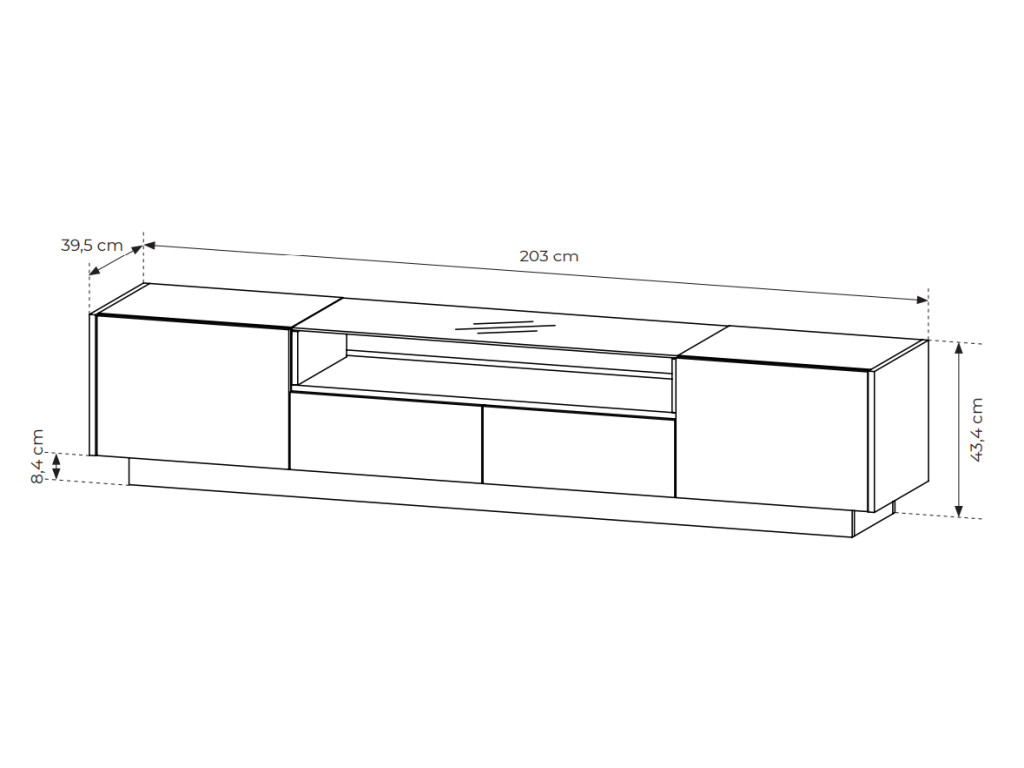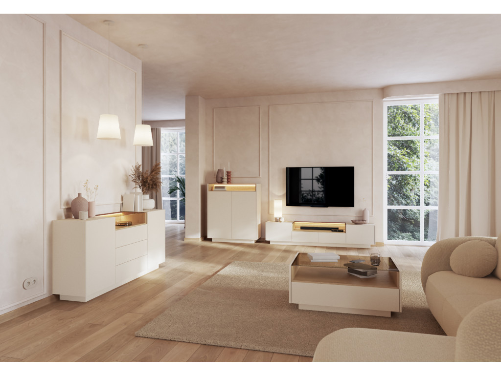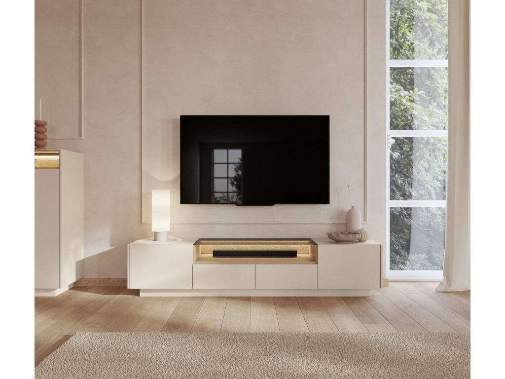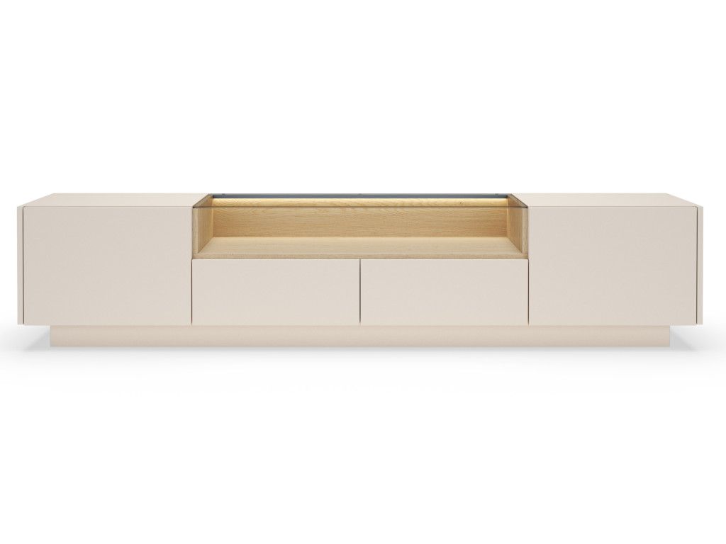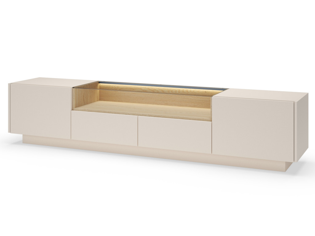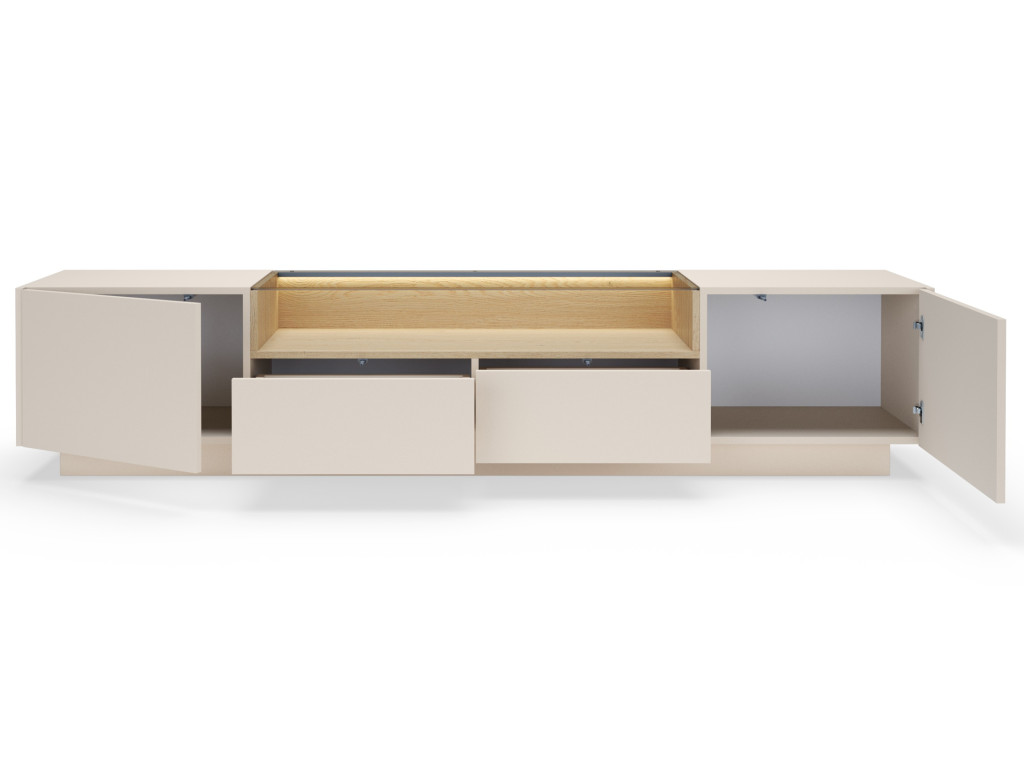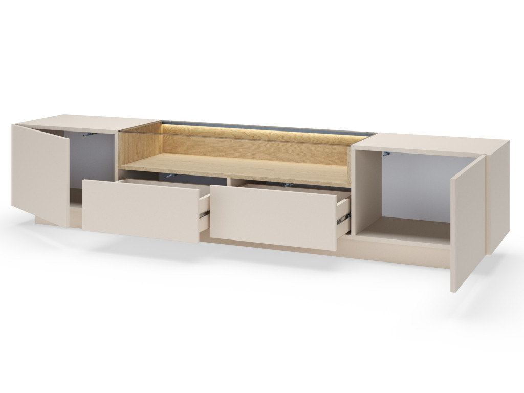 TV stolík disponuje dvomi zásuvkami v strednej časti, nad ktorými sa nachádza otvorená polička s preskleným vrchom a LED osvetlením. Po bokoch sú umiestnené dve skrinky s dvierkami. Vyhotovený je v kombinácii béžová / dub krémový s dôrazom na moderný dizajn bez úchytiek. Otváranie je riešené pomocou push-to-open systému.