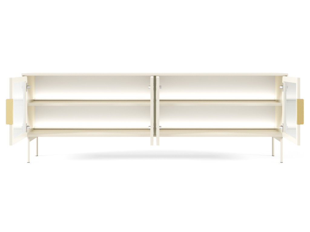 TV stolík Lumus D v jemnom odtieni béžovej kašmírovej farbe je navrhnutý tak, aby spájal moderný vzhľad, praktický úložný priestor a príjemnú atmosféru. Stolík je uzatvorený dvierkami s tvrdeným sklom, za ktorými sa ukrýva miesto na multimediálne zariadenia alebo dekorácie. Vnútro je osvetlené LED profilom s neutrálnym bielym svetlom, ktoré zvýrazní obsah bez oslňovania, čo zabezpečí poriadok a vizuálnu čistotu v obývačke.
