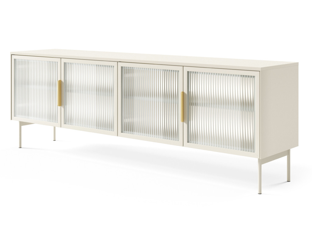 Béžový TV stolík Lumus D kombinuje elegantné línie s praktickým využitím – plocha je zakrytá dvierkami s tvrdeným sklom s LED osvetlením, ktoré poskytujú dostatočný úložný priestor. Zlaté úchytky a kovové nohy podčiarkujú jemný a moderný vzhľad. Skvelý doplnok do svetlej, vkusne zariadenej obývačky.