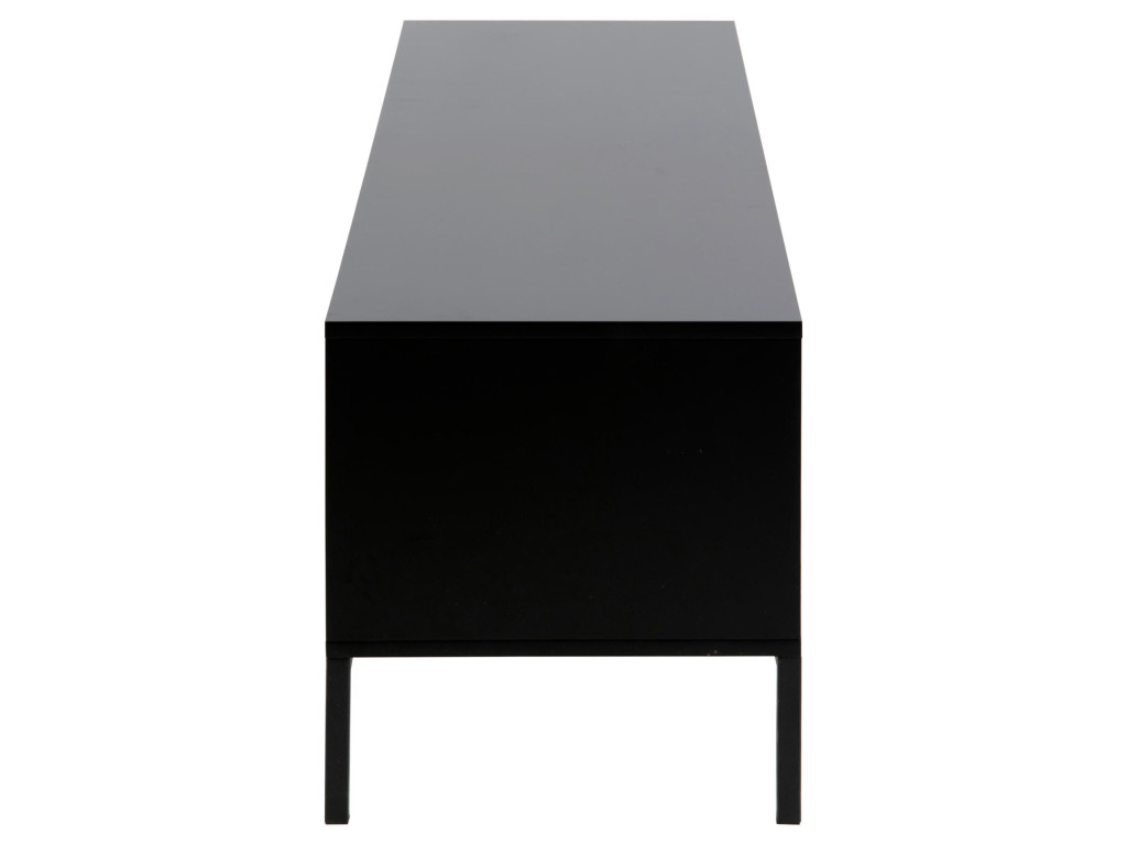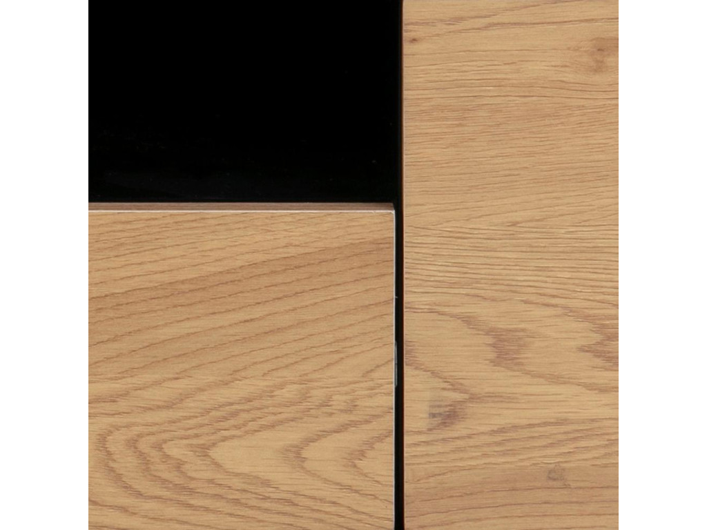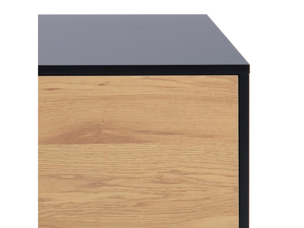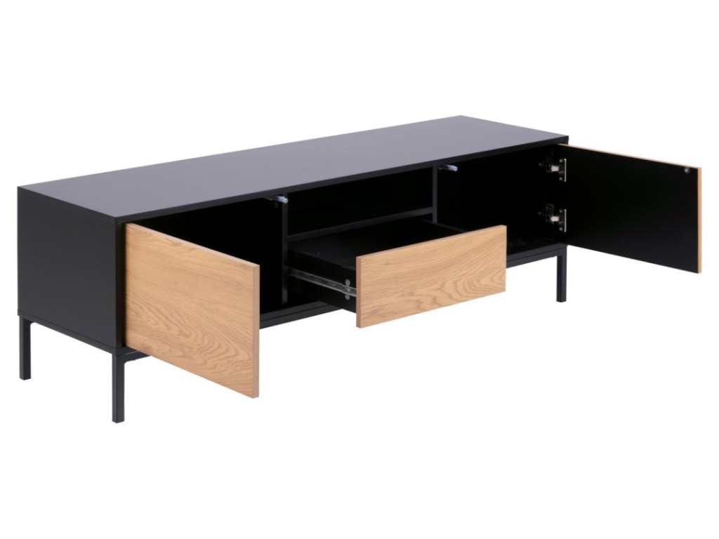 Čierne PU-lakované MDF korpusy sa stretávajú s dvierkami a zásuvkou v dekore matného divokého duba, pričom štíhle štvorcové nohy z ocele (výška 15 cm) odľahčujú formu a pridávajú loftový nádych. Vďaka funkcii push-to-open a tlmenému zatváraniu pôsobí čelo bez úchytiek dokonale čistým dojmom. Horná doska unesie až 40 kg, takže bez obáv podrží aj väčší televízor so soundbarom.