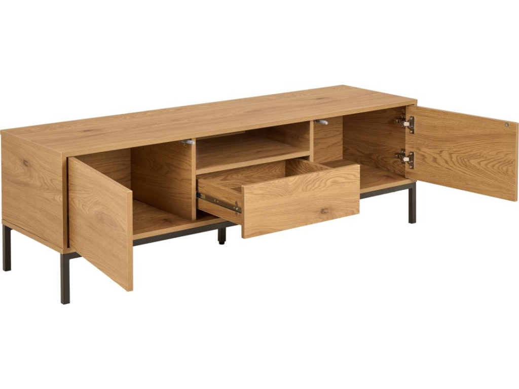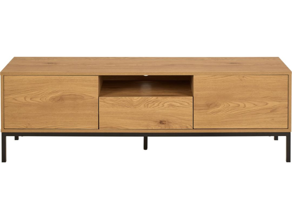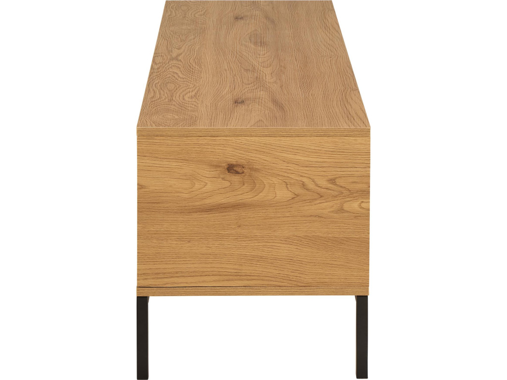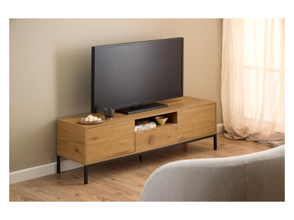 Televízny stolík Seaford ponúka praktické úložné riešenie v štýlovom dizajne. Vrchná doska z divokého duba a čierna kovová základňa tvoria harmonický kontrast. S otvorenou priehradkou, zásuvkou a dvojicou dvierok je ideálny pre organizáciu techniky a doplnkov. Vďaka kovovým výsuvom je manipulácia plynulá a tichá.