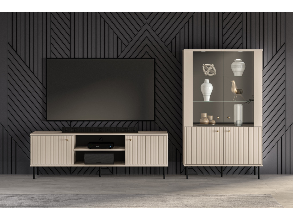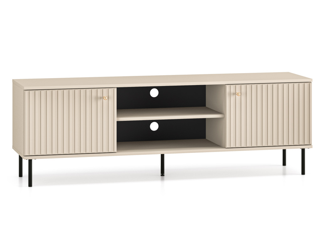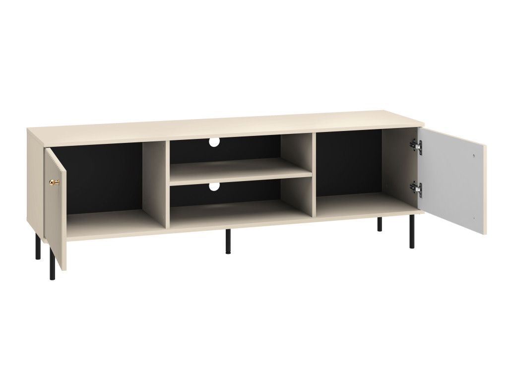 TV stolík Sophie 06 je štýlový a praktický kus nábytku s dvomi uzavretými priehlbinami, otvorenými policami a širokou doskou na usporiadanie multimediálneho vybavenia. Kašmírvo béžový dekor, frézované čelá, zlaté úchytky a čierne nožičky prinášajú moderný dizajn a eleganciu do vášho interiéru.