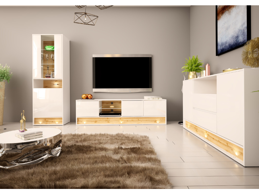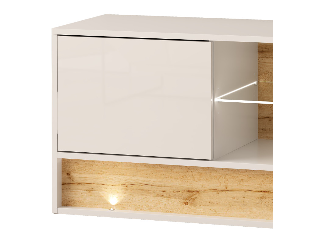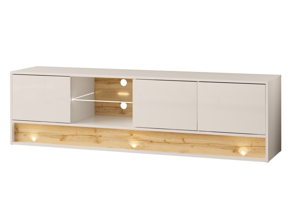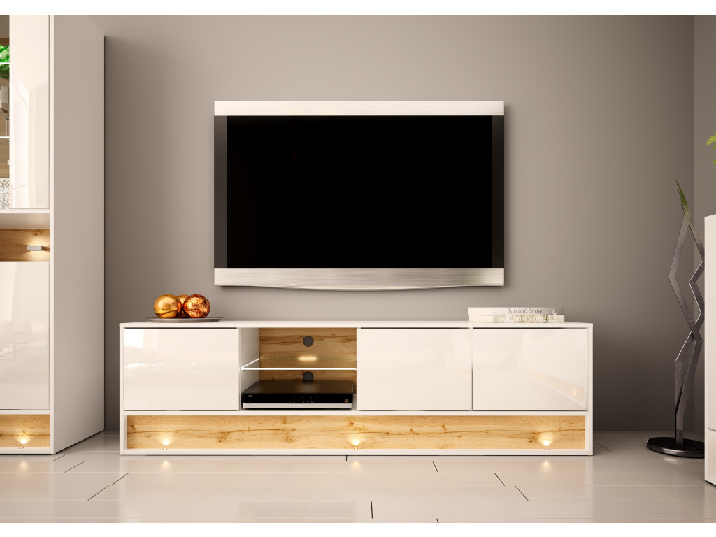 Elegantný TV stolík s tromi dvierkami, otvoreným priestorom so sklenenou policou a podsvietením. Vyniká kombináciou bieleho lesku a dekoru dub wotan. Integrované podsvietenie spodnej lišty dodáva stolíku moderný a útulný vzhľad, zatiaľ čo praktické detaily zaručujú pohodlné používanie.