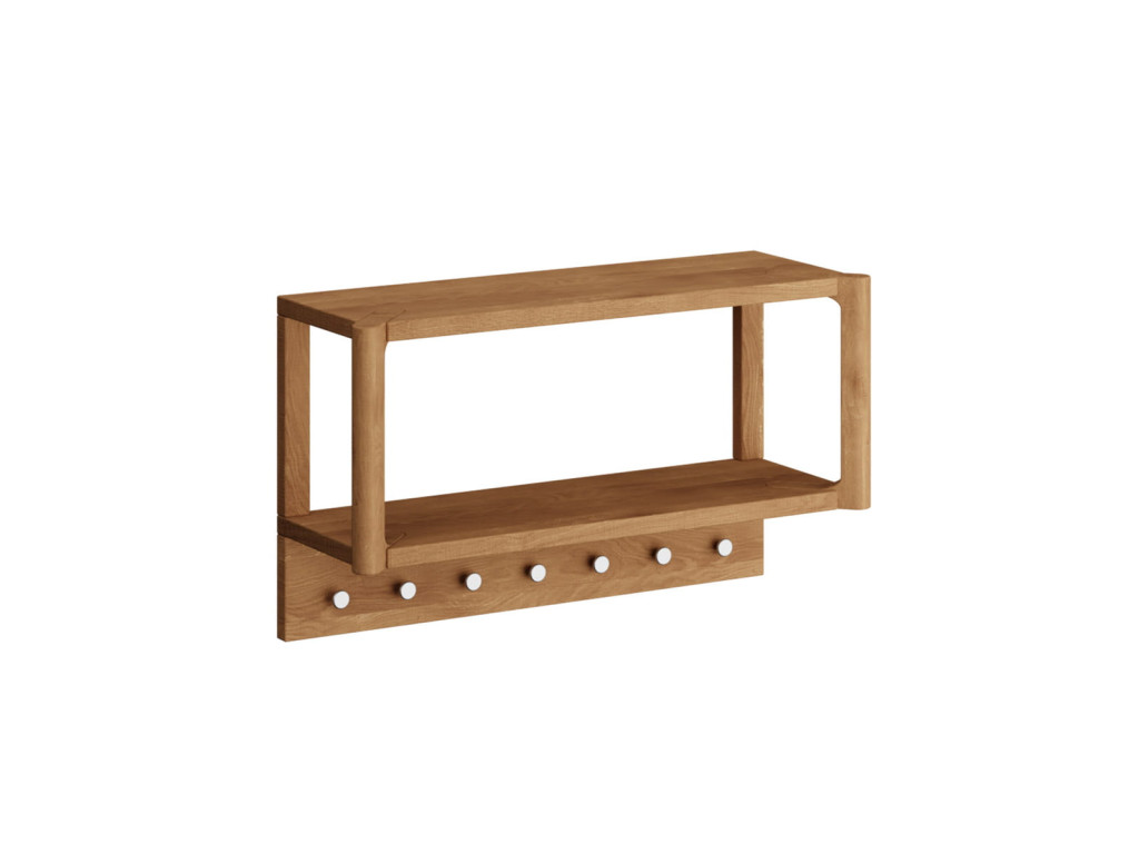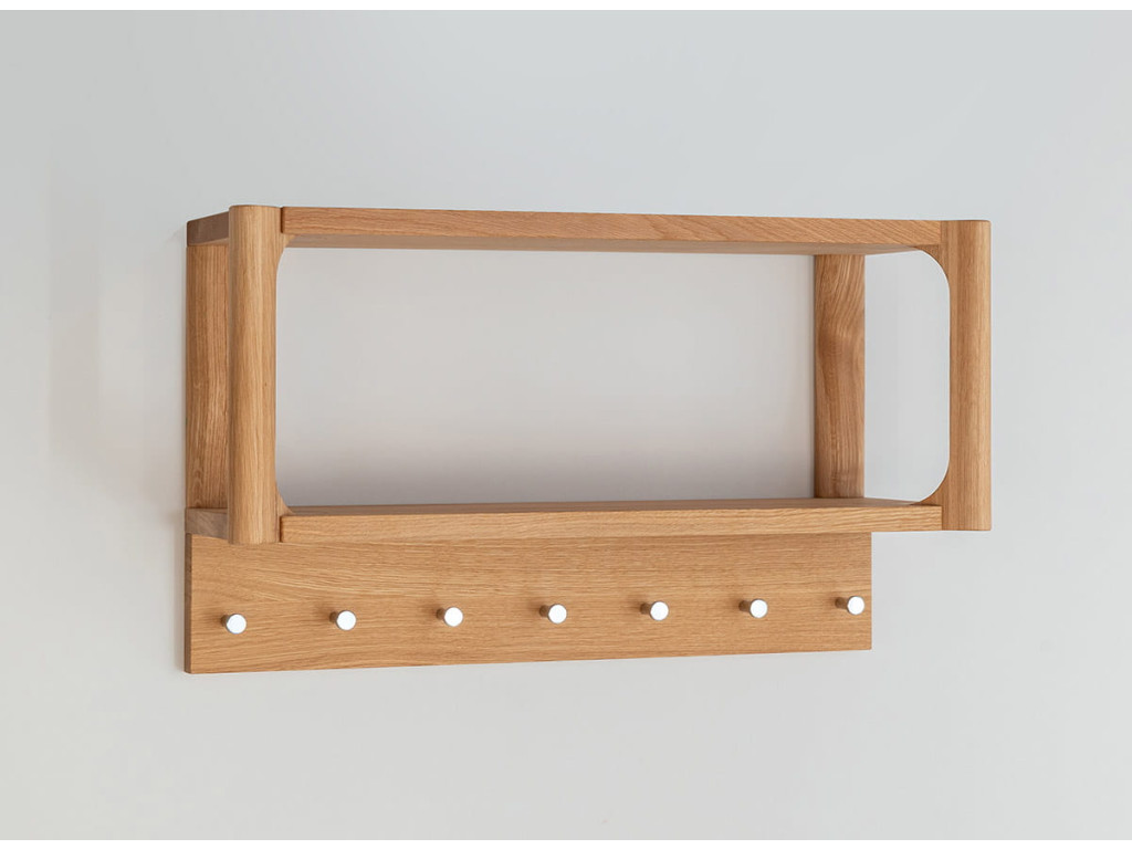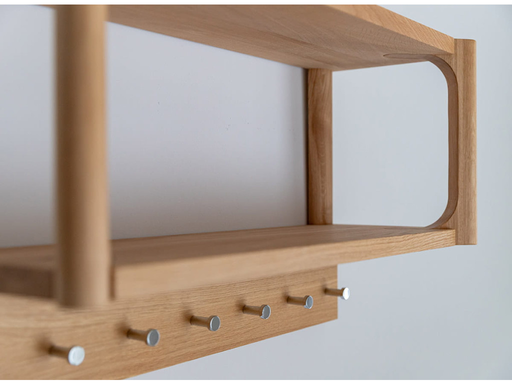 Malý nástenný vešiak z kolekcie Campi z masívneho dubového dreva ponúka praktické riešenie pre organizáciu predsiene v minimalistickom štýle. Je vybavený viacerými drevenými kolíkmi a hornou policou, ktoré poskytujú dostatok priestoru na kabáty, tašky aj doplnky. Povrch je upravený olejovaním v polomatnom prevedení, čo zvýrazňuje prirodzenú kresbu dreva a zabezpečuje jeho ochranu. Vďaka kompaktným rozmerom je ideálny aj do menších priestorov. Rozmery: 63 × 36 × 21,5 cm (š × v × h).