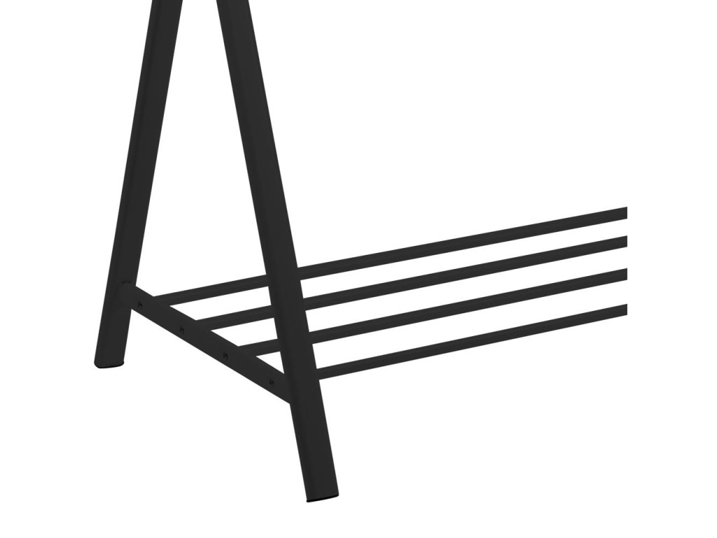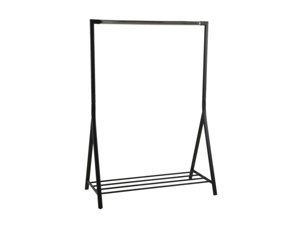 Praktický a elegantný vešiak Brent v čiernej farbe s chrómovým prvkom je ideálnym riešením na rýchlu organizáciu odevov. Otvorený dizajn vám umožní mať všetko oblečenie prehľadne na očiach a pripravené na ďalší deň. Spodná polica poskytuje priestor pre topánky či doplnky a stabilná kovová konštrukcia zabezpečuje pevnosť a odolnosť pri každodennom používaní.
