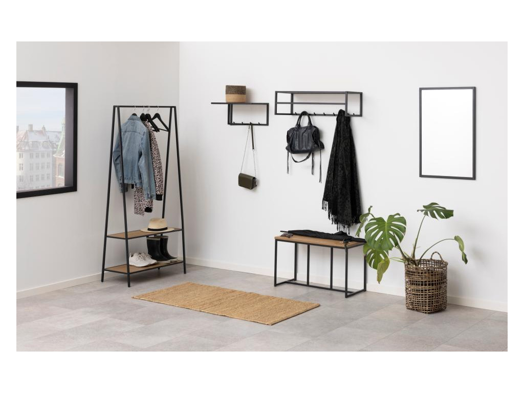 Vešiak na stenu Seaford je ideálnym riešením pre vstupné priestory alebo predsiene. Kombinácia matnej čiernej ocele a dubového dekoru vytvára moderný a zároveň prírodný vzhľad. Vďaka kompaktným rozmerom nezaberá veľa miesta, ale poskytuje praktický úložný priestor na bundy, tašky či klobúky.
