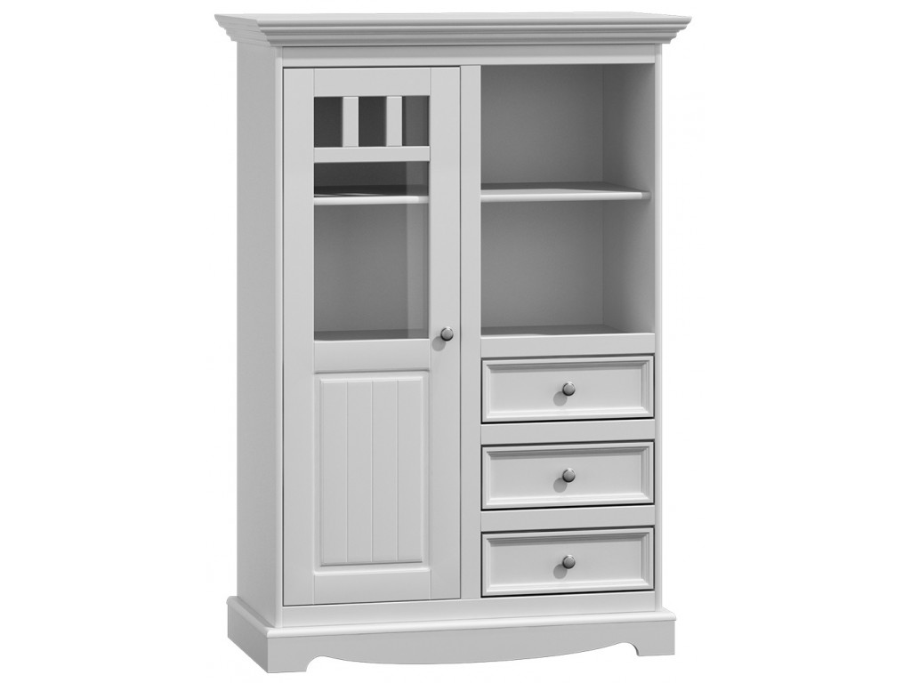 Predstavujeme klasickú vitrínu do obývačky s presklenými dvierkami. Je mimoriadne priestranná a okrem krásneho vzhľadu poskytuje aj vysokú funkčnosť. Má frézované zásuvky, otvorené police a presklené police. Biela vitrína bola vyrobená z najkvalitnejšieho fínskeho borovicového dreva.