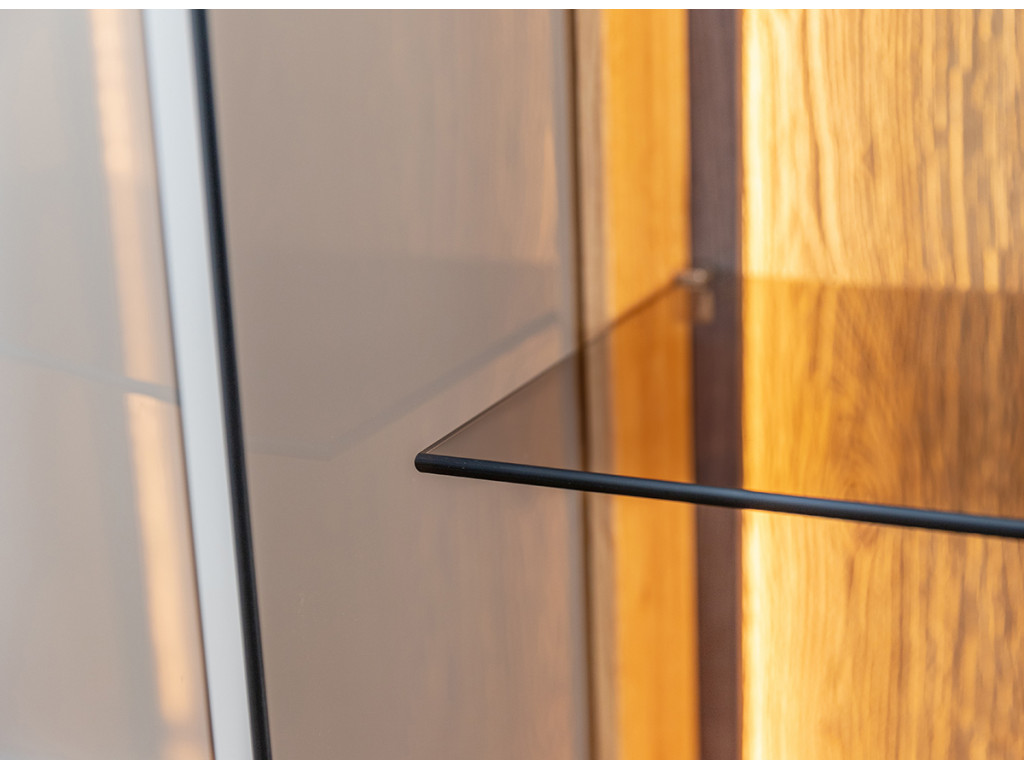Vychutnajte si dômyselný dizajn a praktické vybavenie masívnej vitríny, ktorá splní očakávania aj tých najnáročnejších používateľov. Plné dvierka ukrývajú priestrannú skrinku rozdelenú policami, ktorá je ideálna na uloženie rôznych predmetov. Sklenená časť sa zasa vďaka skleneným policiam stane ideálnym miestom na vystavenie dekorácií z dovoleniek, kníh alebo obľúbených zbierok. Dodatočné osvetlenie pomôže zamerať pozornosť na vystavený obsah, čím sa vitrína stane dekoratívnym stredobodom každej miestnosti.