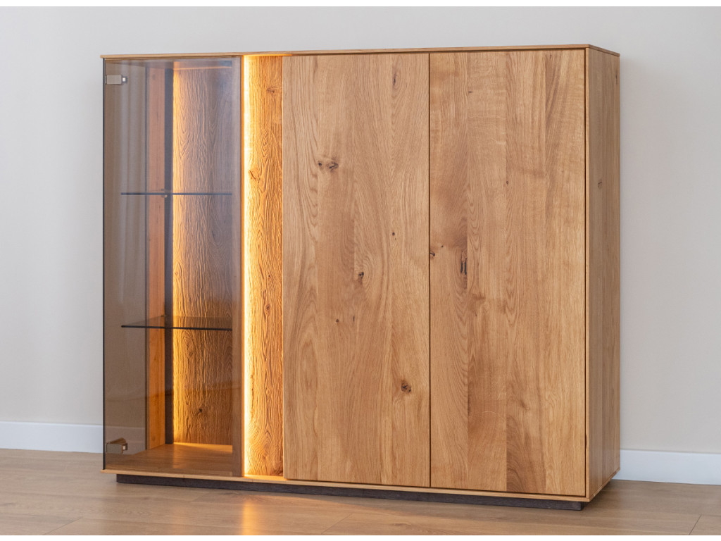 Dubová vitrína z kolekcie Collodi je rozdelená na dve časti - na pravej strane je masívne čelo s dvoma pármi drevených dvierok a na druhej strane presklená plocha so sklenými poličkami, ktorá dodáva interiéru nádych ľahkosti. Doplnkové osvetlenie zvýrazní krásu vystavených predmetov. Vitrína skvele zapadne do priestorov zariadených v minimalistickom, loftovom alebo provensálskom štýle.
