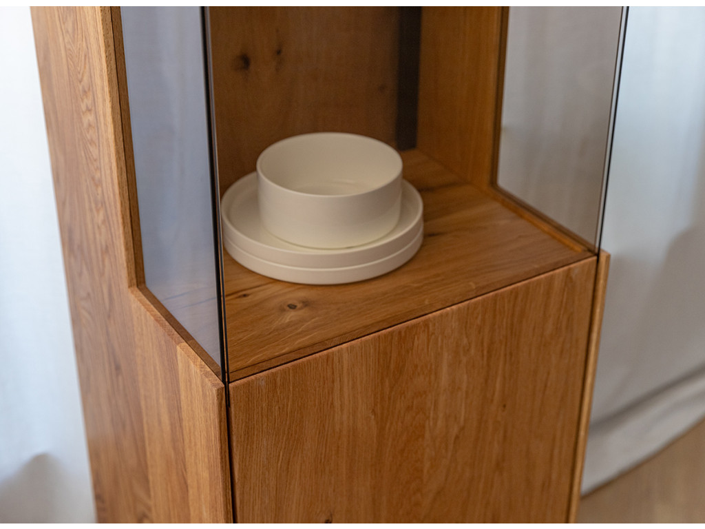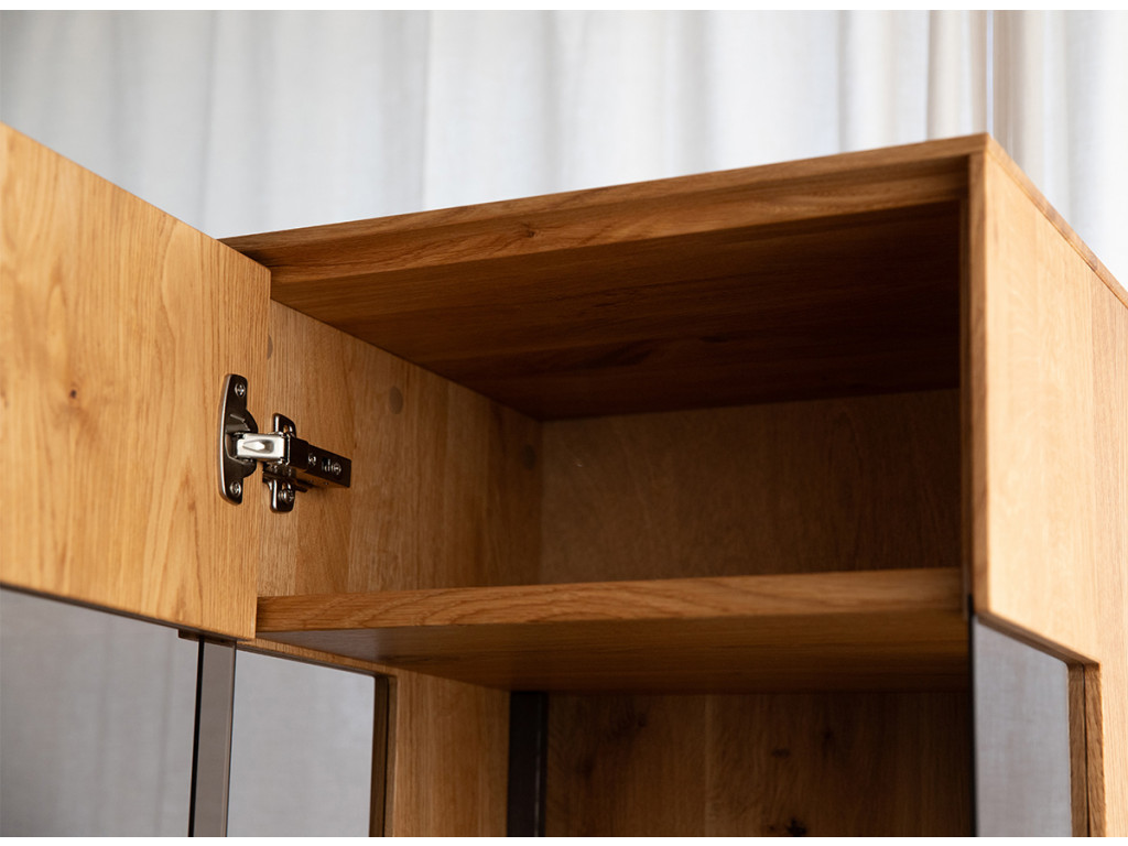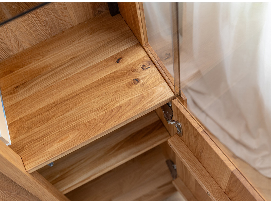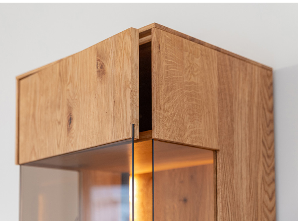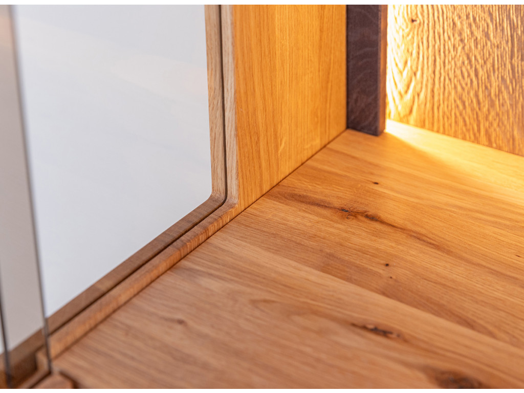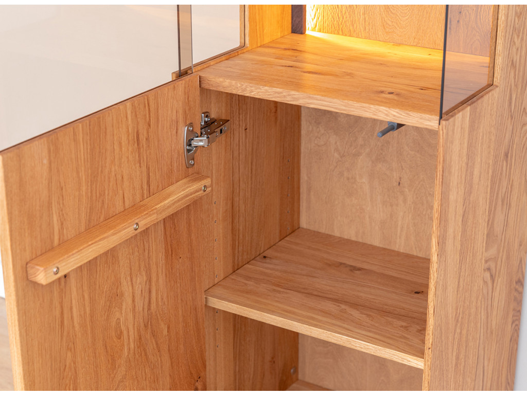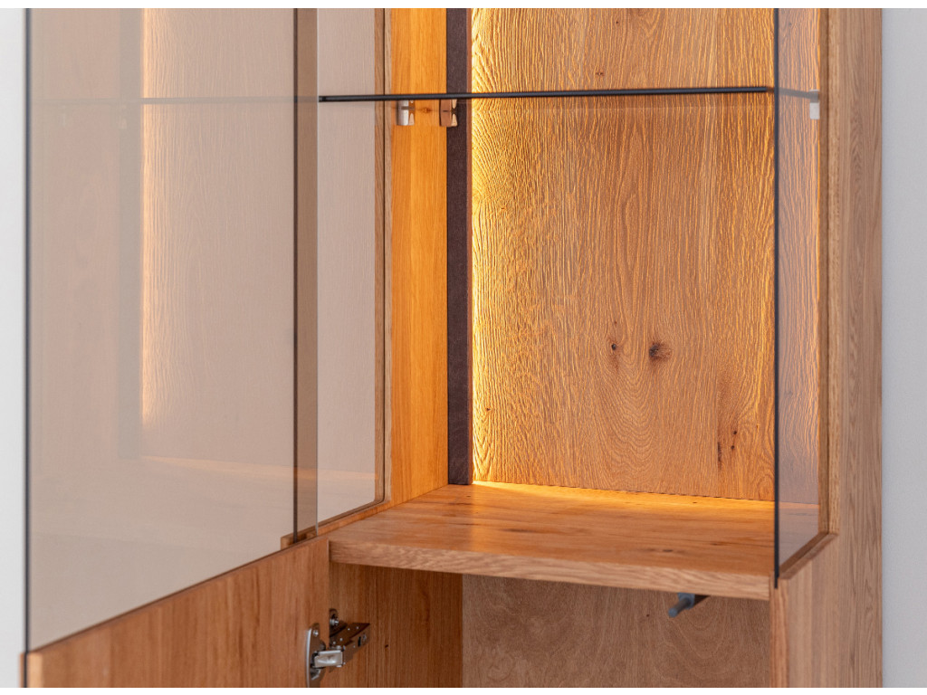 Drevená vitrína Collodi s presklenou časťou reprezentuje kvalitný dubový nábytok, ktorý vďaka svojmu precíznemu vyhotoveniu a starostlivému ošetreniu prírodnými olejmi vydrží v bezchybnom stave po dlhé roky. Olejovanie ako povrchová úprava materiálu zároveň zvýrazňuje prirodzenú štruktúru masívu a dodáva nábytku dlhú životnosť.
