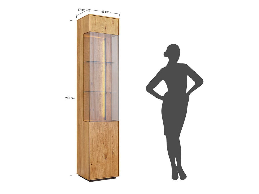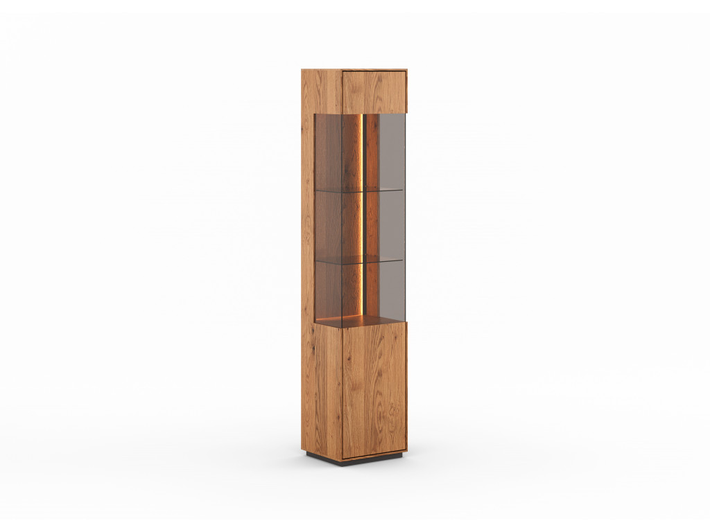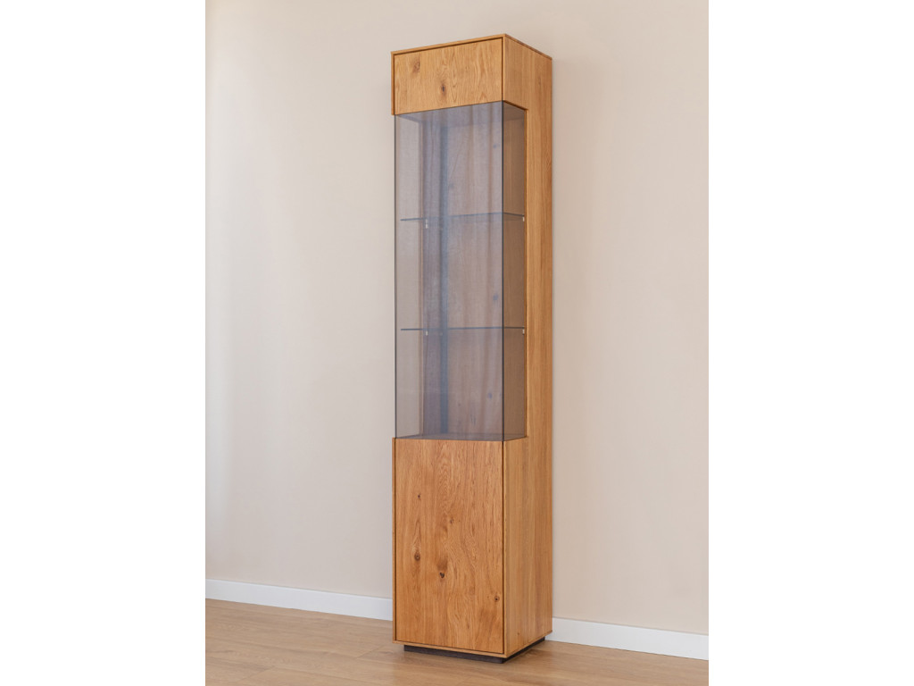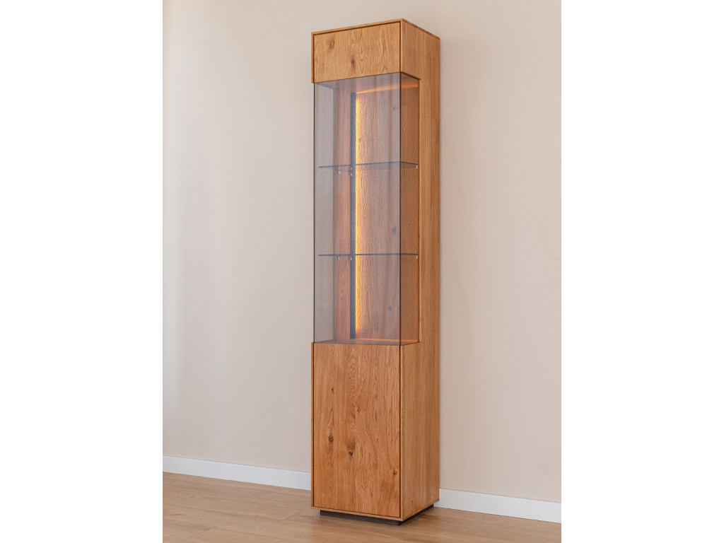 Masívna vitrína z kolekcie Collodi je elegantná a nadčasová. Oplýva minimalistickým, no napriek tomu plnohodnotne funkčným dizajnom, ktorý odráža praktický prístup k usporiadaniu vnútorného priestoru. V hornej časti sa nachádza presklená časť dvierok so sklenými policami, vytvárajúca vhodný priestor na vystavenie suvenírov, dekorácií či trofejí, na ktoré ste patrične hrdí a chcete ich zviditeľniť. Police ukryté za plnou časťou dvierok umožňujú odložiť veci, ktoré majú zostať ukryté pred zrakom nepovolaných. Devízou tejto vitríny z duba je aj možnosť doplnenia jemných svetelných bodov vo vnútornej časti vitríny.