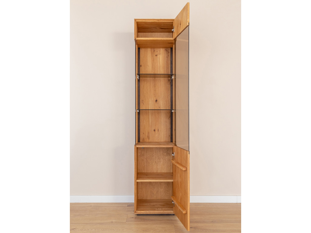 Masívna vitrína Collodi v úzkom dizajne je typická svojím štíhlym profilom a čiastočne presklenými dverami. Je zhotovená z dubového dreva natretého prírodnými olejmi, ktoré chránia a ošetrujú jej povrch a tiež zvyšujú trvácnosť a odolnosť nábytku. Ak si želáte zariadiť celú obývačku, jedáleň alebo pracovňu, môžete ju vhodne skombinovať s ďalším nábytkom z kolekcie Collodi.