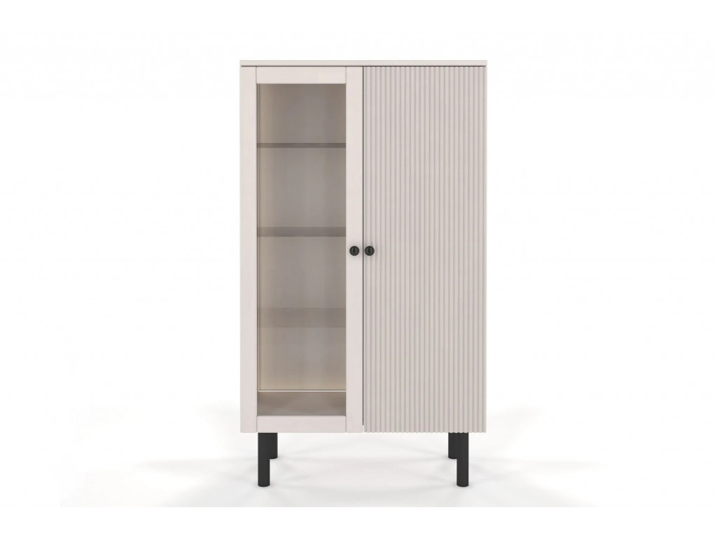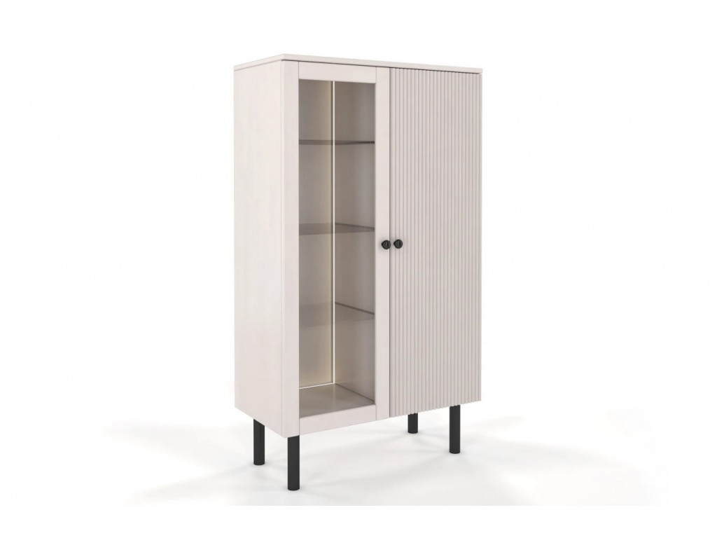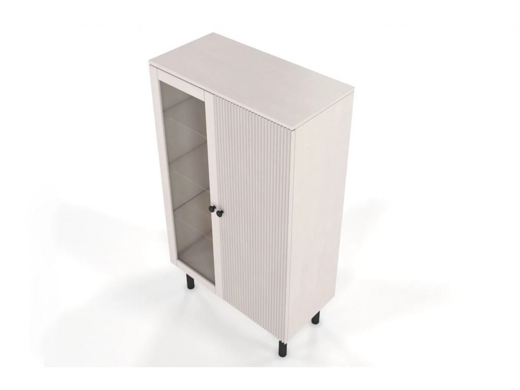 Elegantný a funkčný kus nábytku, sa bude skvele hodiť do obývačky, pracovne aj jedálne. Ľavé, presklené krídlo dverí - dokonale odhaľuje predmety umiestnené vo vnútri a chráni ich pred prachom. Pravé krídlo, ktoré zdobí efektné vertikálne frézovanie, ukryje osobné veci a dodá celku moderný rozmer.