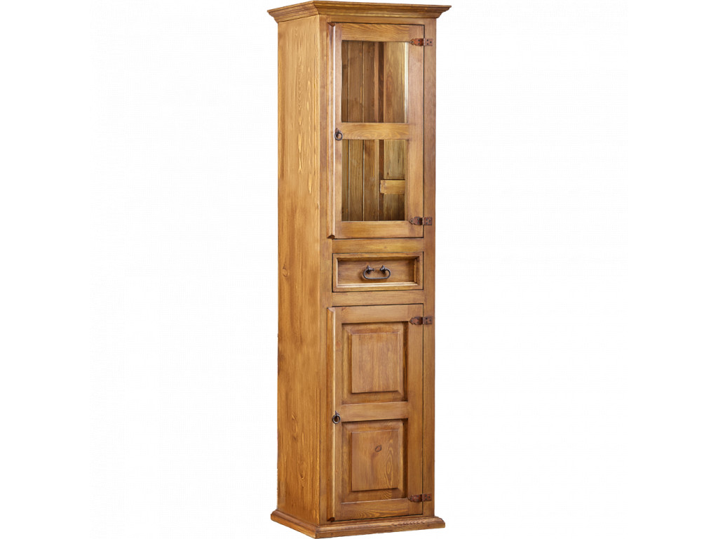 Úzka vitrína dokonale zapadne k ostatným kúskom masívnej zostavy Gerlach. Hodí sa najmä do tradičných interiérov, chát či zrubových domov. Pánty a rukoväte sú ručne kované zo železa a podrobené procesu hrdzavenia. Zdôrazňujú tak rustikálny štýl kolekcie.