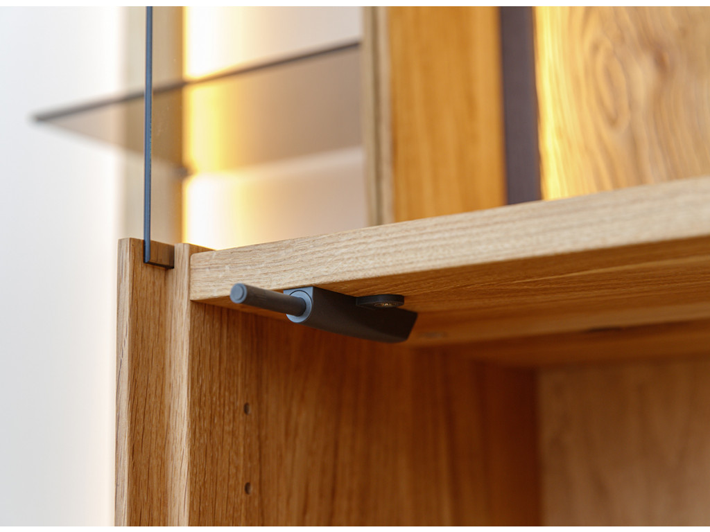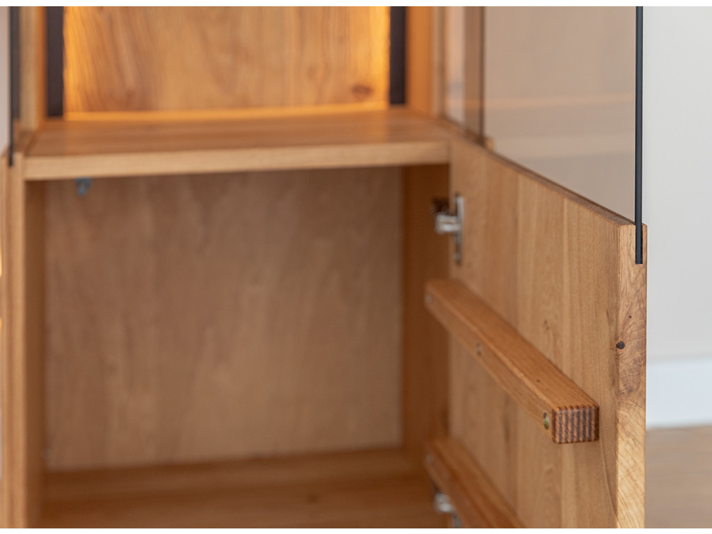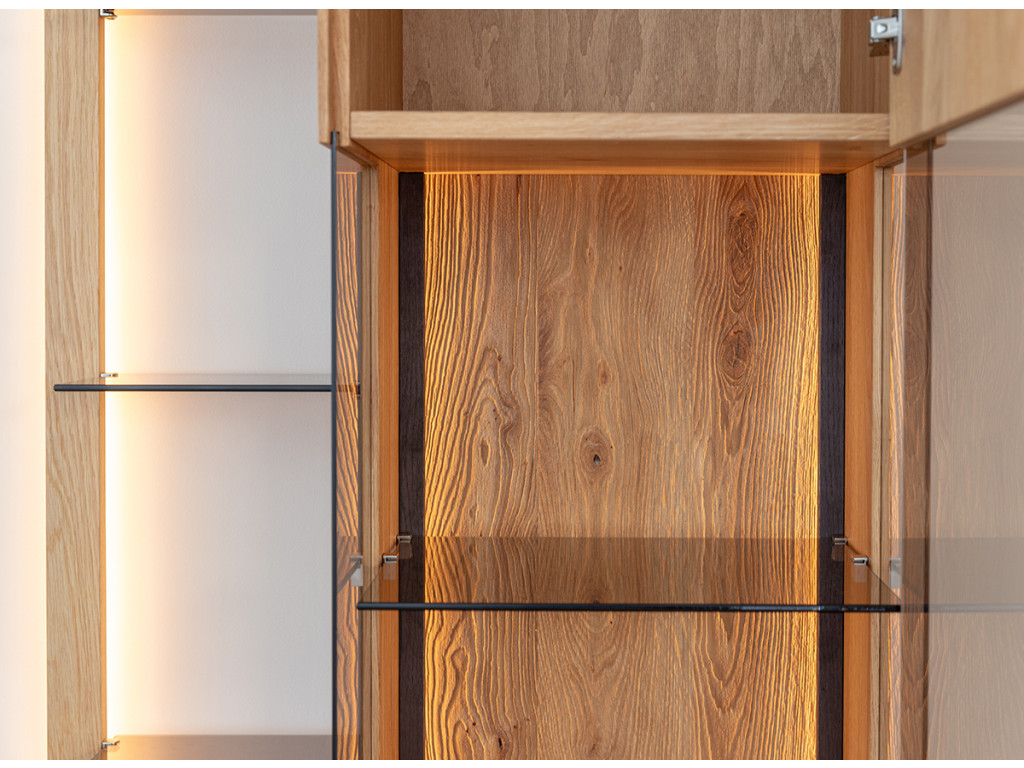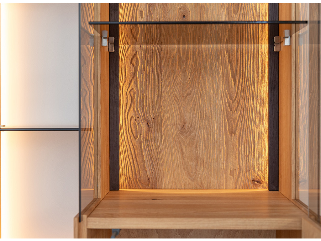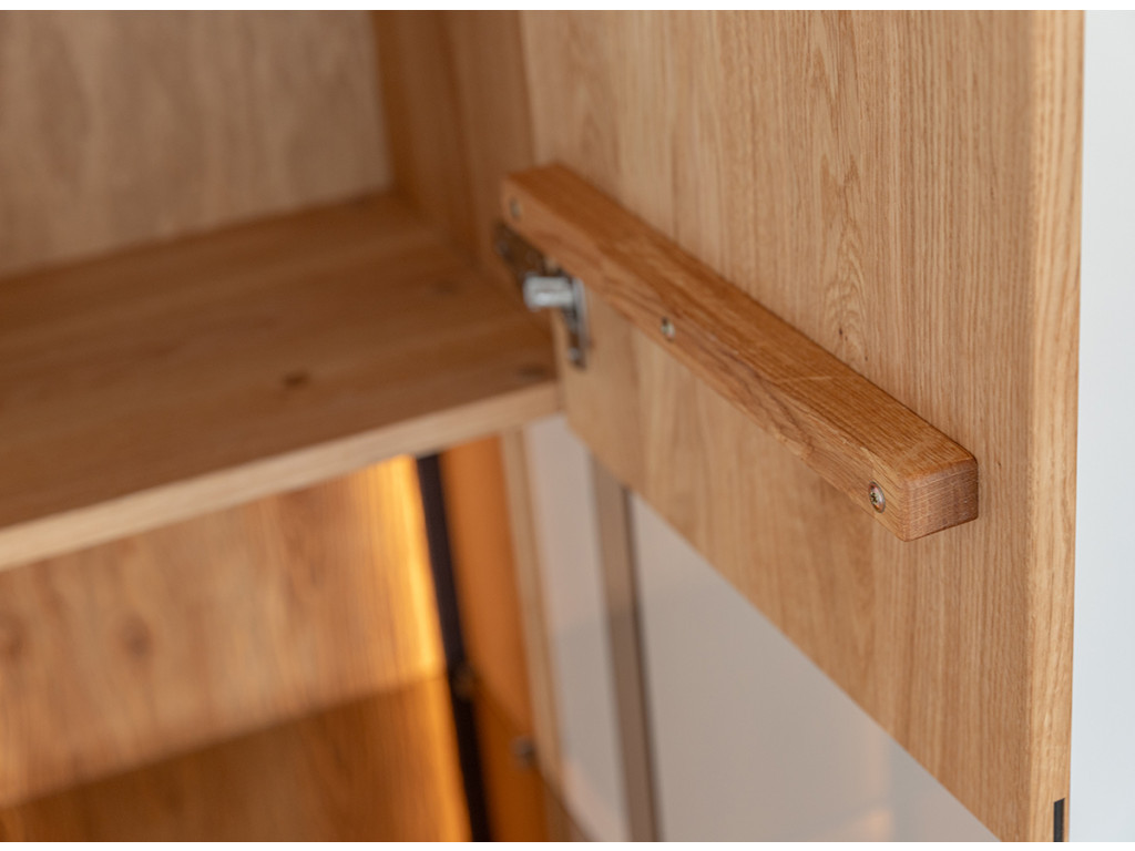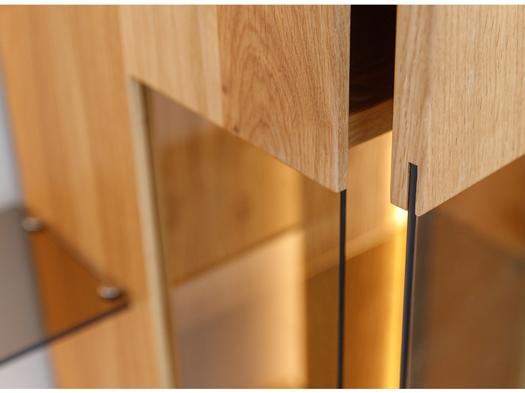 Kombinácia estetiky a funkčnosti v podobe vitríny Collodi z olejovaného dubového dreva je dokonalým riešením pre tých, ktorí hľadajú nábytok, ktorý je originálny a zároveň užitočný. Obzvlášť zaujímavé na komode sú dvierka, ktoré sú čiastočne presklené a čiastočne plné. Vďaka zabudovanému osvetleniu umožňuje vytvoriť v miestnosti nádhernú atmosféru, ktorá zvýrazní charakter vystavených exponátov.
