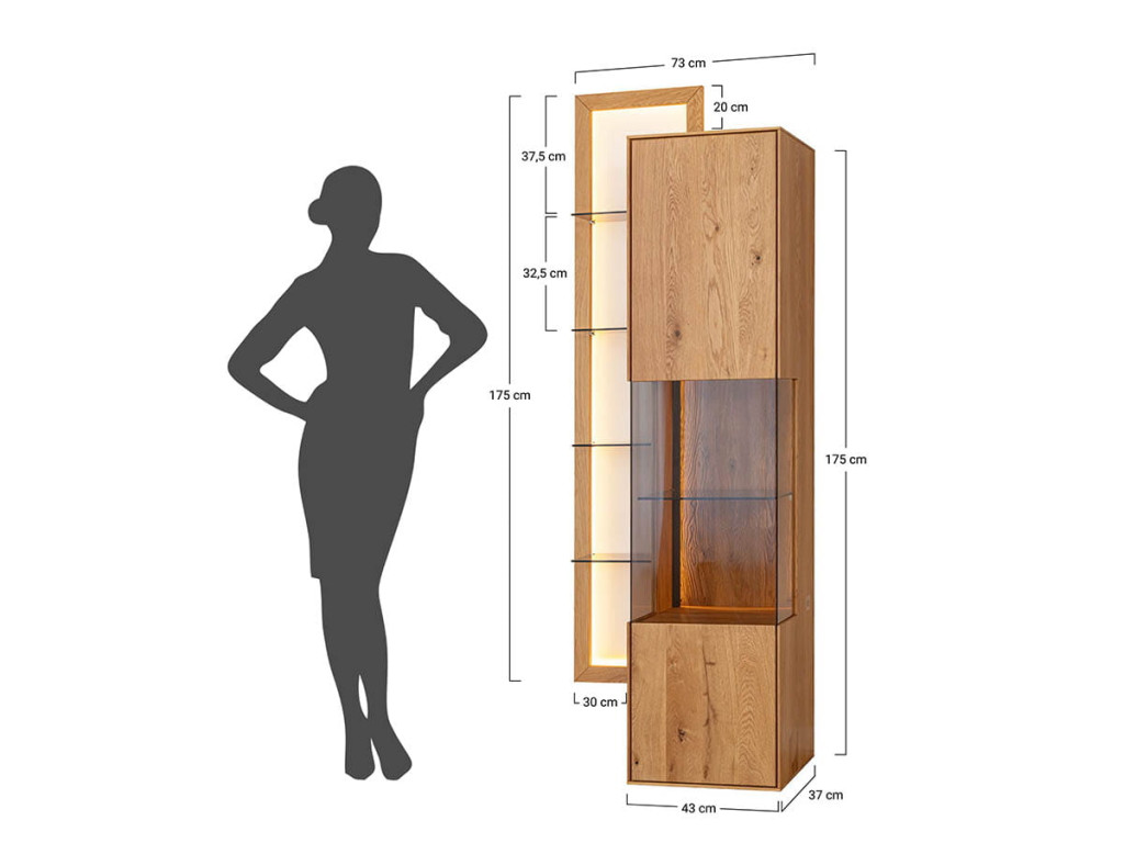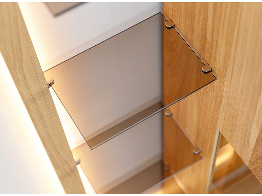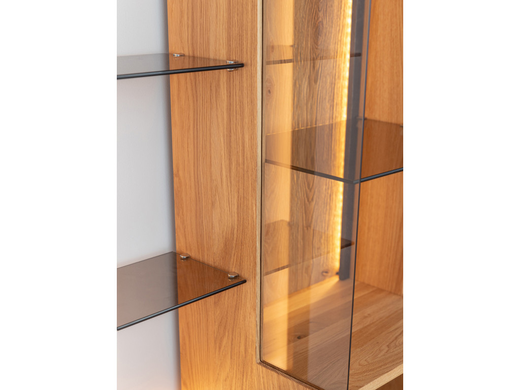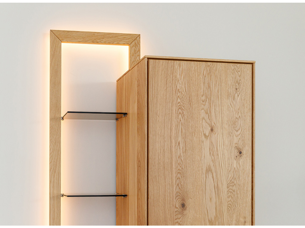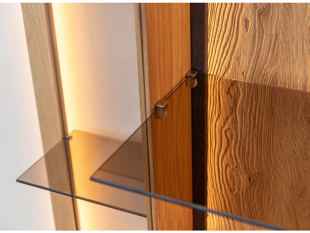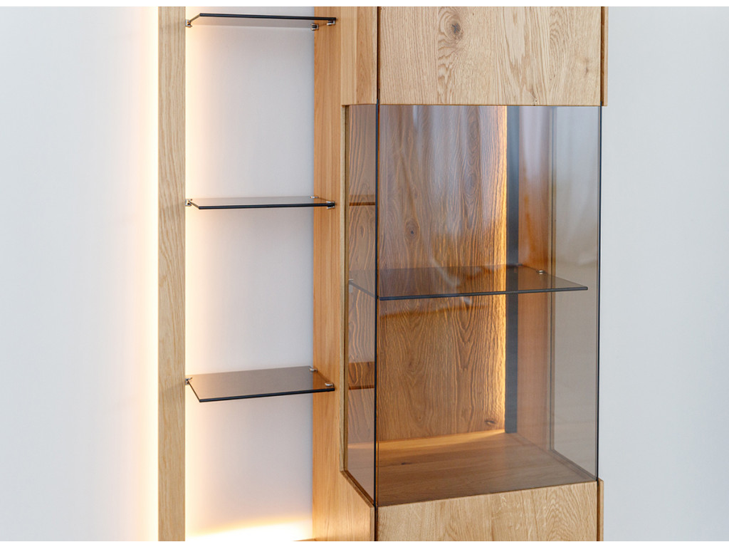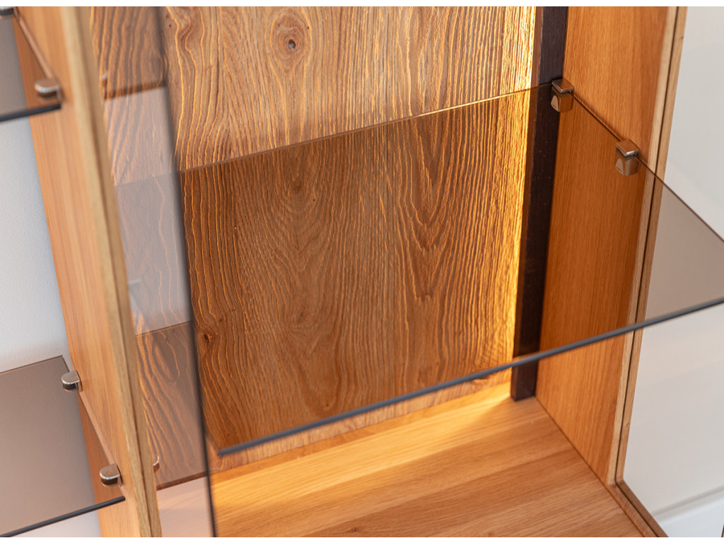 Kombinácia estetiky a funkčnosti v podobe vitríny Collodi z olejovaného dubového dreva je dokonalým riešením pre tých, ktorí hľadajú nábytok, ktorý je originálny a zároveň užitočný. Obzvlášť zaujímavé na komode sú dvierka, ktoré sú čiastočne presklené a čiastočne plné. Vďaka zabudovanému osvetleniu umožňuje vytvoriť v miestnosti nádhernú atmosféru, ktorá zvýrazní charakter vystavených exponátov.