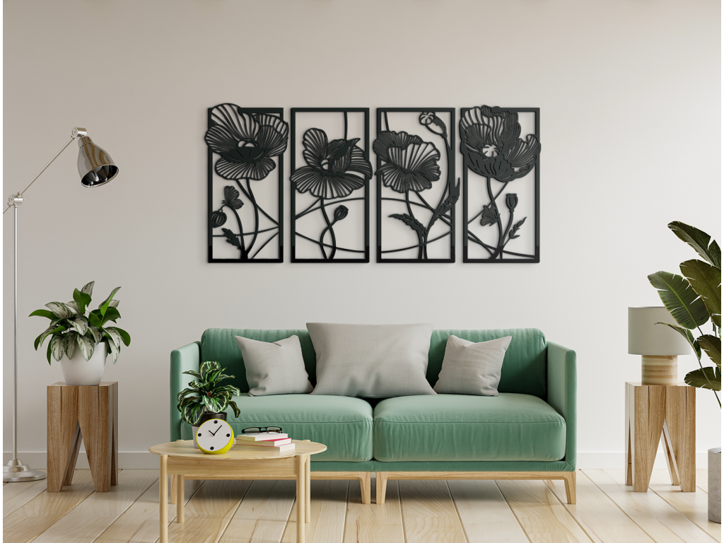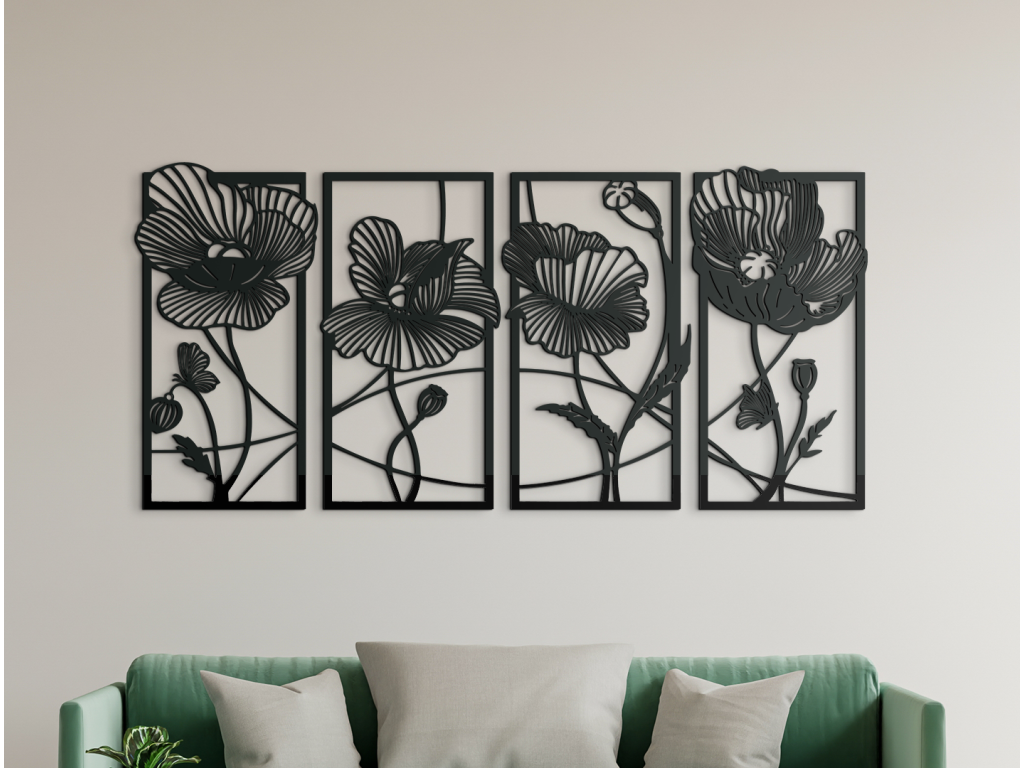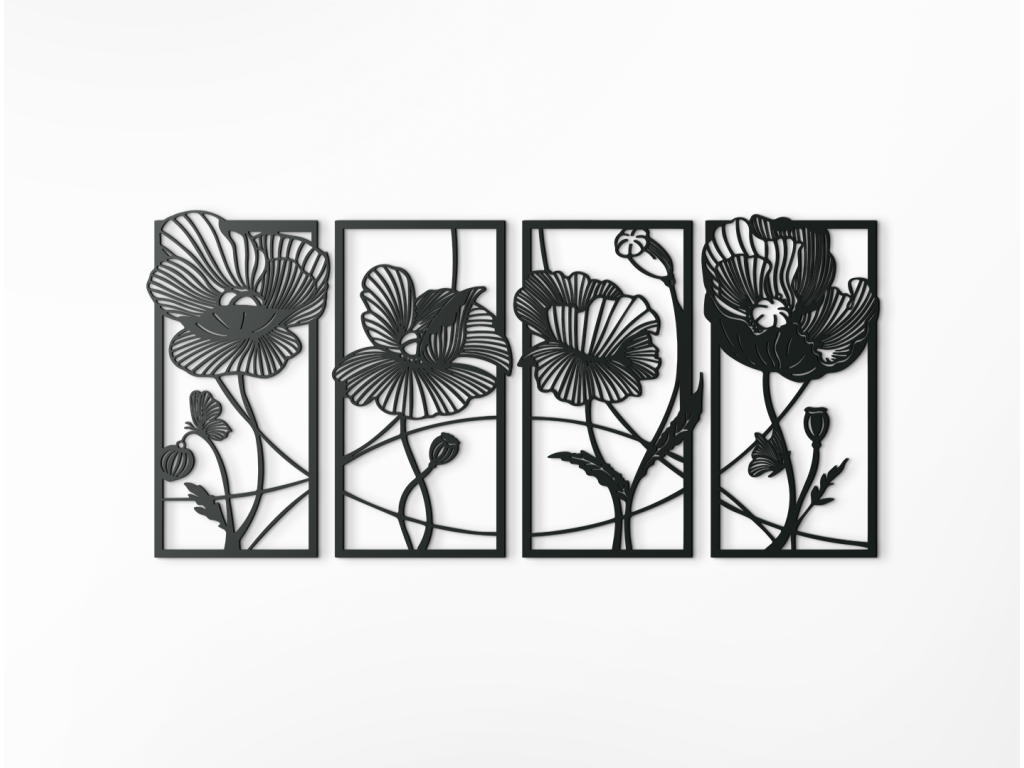 Moderná 3D dekorácia do bytu je originálnym prvkom, ktorý vynikne v každej miestnosti domu. Obraz sa skladá zo 4 dizajnovo prepojených dielov - jednotlivé diely so sebou súvisia. Sú na nich vykreslené divé maky vyčnievajúce z rámu. Obraz je doplnkom, z ktorého sa budete tešiť naozaj dlho.