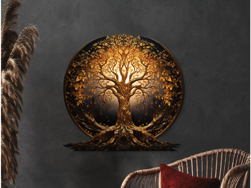 Elegantná okrúhla dekorácia zobrazuje zlatý Strom života s bohato rozvetvenými koreňmi a korunami listov, ktoré žiaria jemnou zlatou farbou. Kompozícia pôsobí harmonicky a vyvážene, pričom zdôrazňuje symboliku životnej sily, rastu a spojenia medzi nebom a zemou.