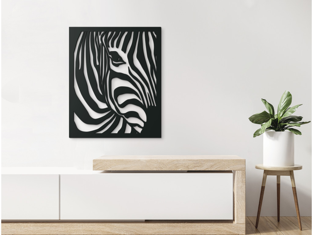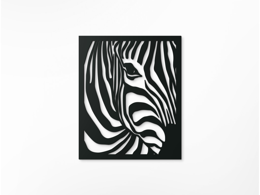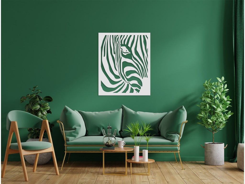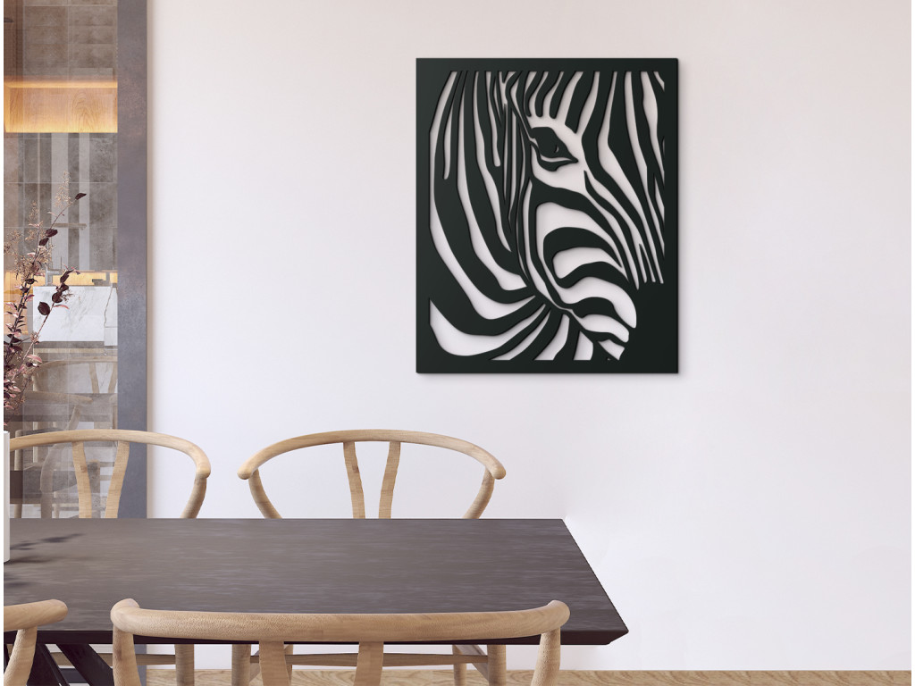 Vyrezávaný obraz so zvieracím motívom je pôsobivým doplnkom do každého interiéru. Krásne vynikne na stene v obývačke, spálni aj chodbe. Dekorácia na stenu znázorňuje pohľad na zebriu hlavu z mierneho profilu, akoby sa k vám približovala s napoly odvrátenou tvárou. Zachytáva pritom jej skúmavý pohľad a typické pruhované sfarbenie srsti.