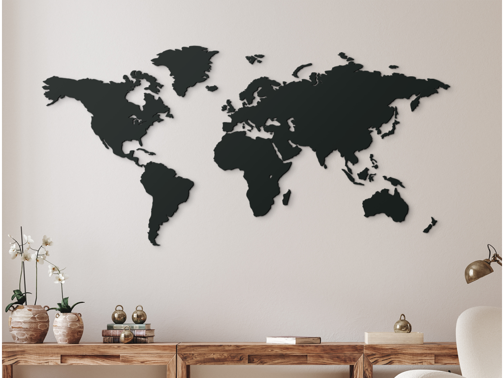 Moderná mapa sveta na stenu pre cestovateľské duše aj priaznivcov moderného štýlu. Mapa sa skladá z viacerých dielov, ktoré jednoducho pripevníte pomocou šablóny. Je vhodná do domáceho prostredia aj firemných priestorov, kde vzbudí usporiadaný elegantný dojem.