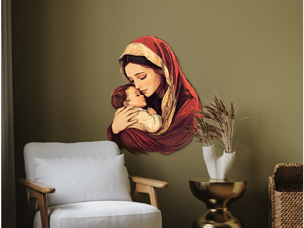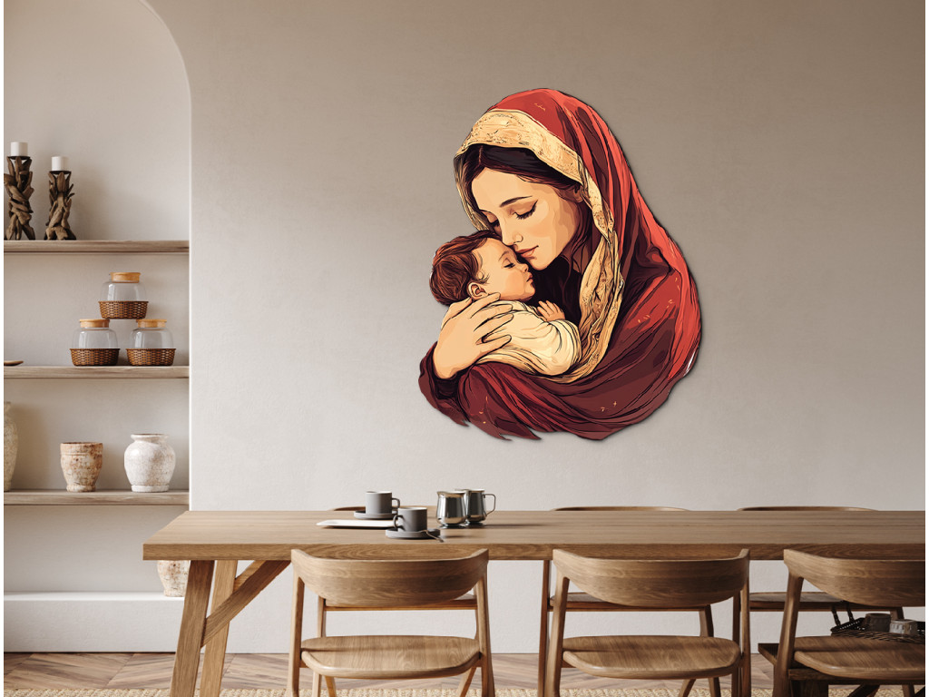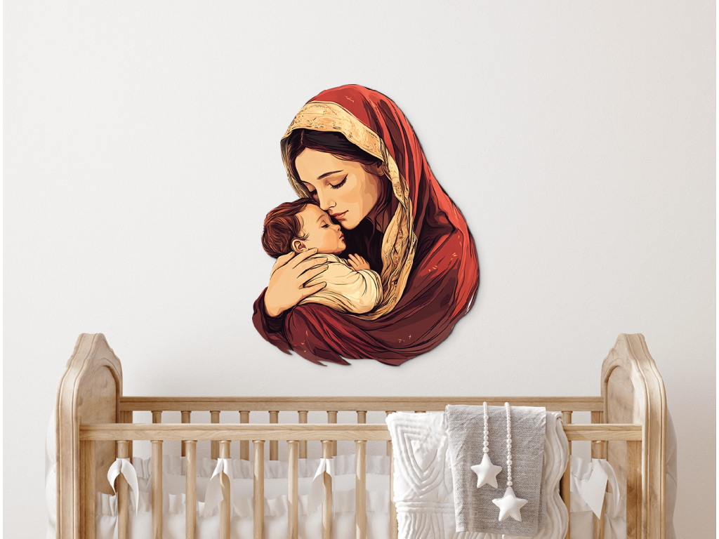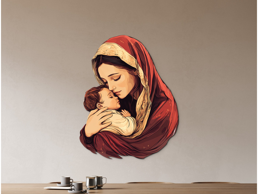 Obraz zachytáva nežný moment medzi Matkou Máriou a jej dieťaťom Ježišom – symbol hlbokej, bezpodmienečnej lásky a ochrany. Materská náruč predstavuje prvý pocit bezpečia, prijatia a dôvery, ktorý formuje emocionálny základ dieťaťa na celý život. Toto silné puto je prejavom čistej empatie, starostlivosti a prirodzenej túžby matky postarať sa o blaho svojho dieťaťa – s láskou, ktorá nepozná hranice.