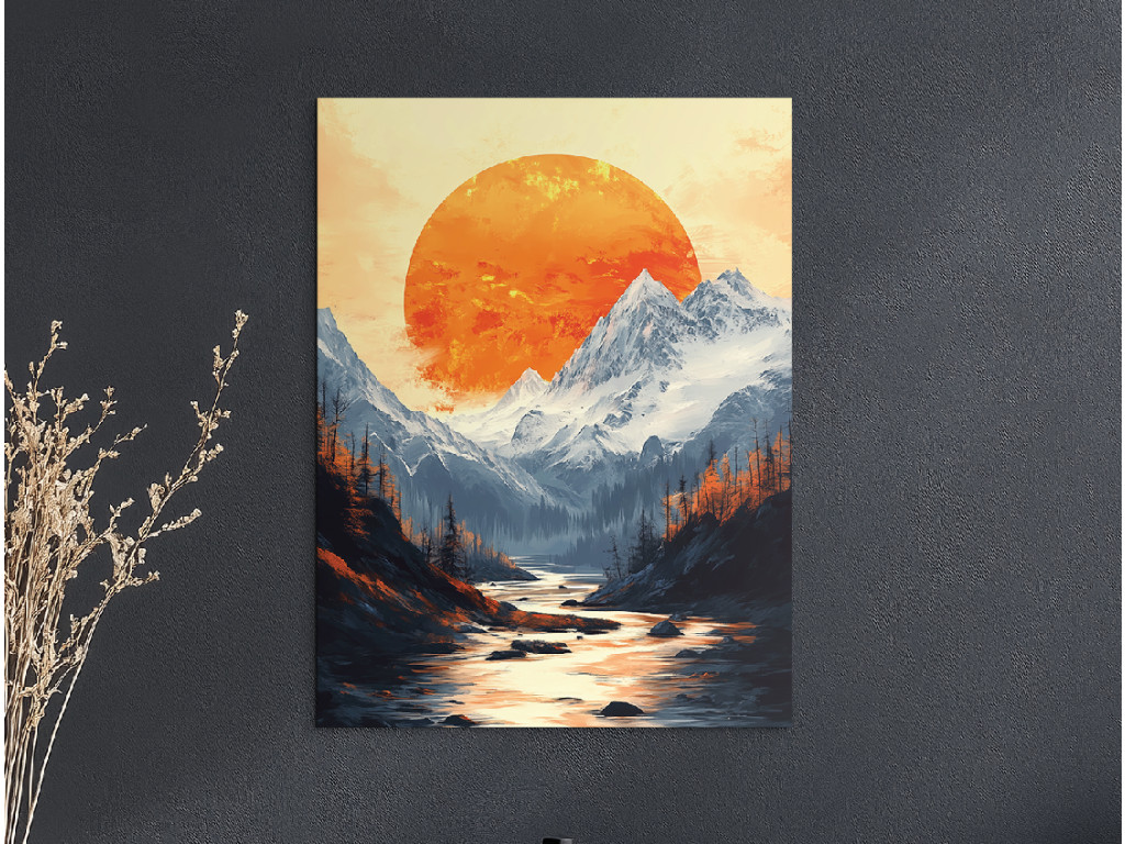 Obraz zobrazuje dramatickú horskú krajinu pod večernou oblohou. V pozadí dominuje veľký, sýto oranžový mesiac, ktorý osvetľuje siluety skalnatých štítov a hustého lesa v popredí. Teplé odtiene oblohy kontrastujú s tmavými obrysmi stromov a hôr, čím vytvárajú silnú vizuálnu atmosféru plnú pokoja a tajomna.