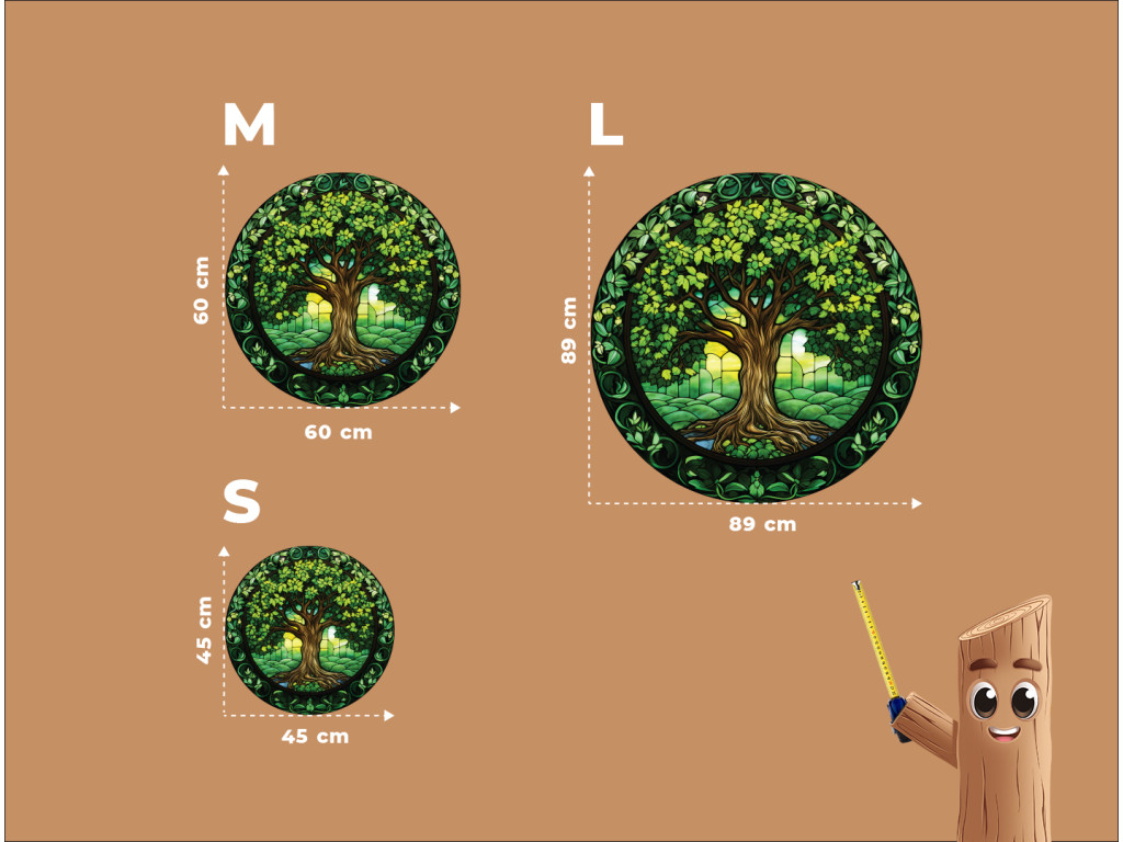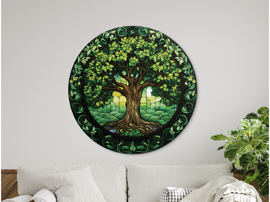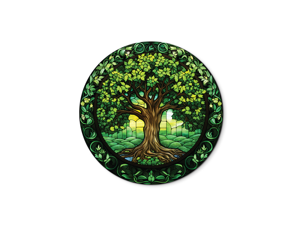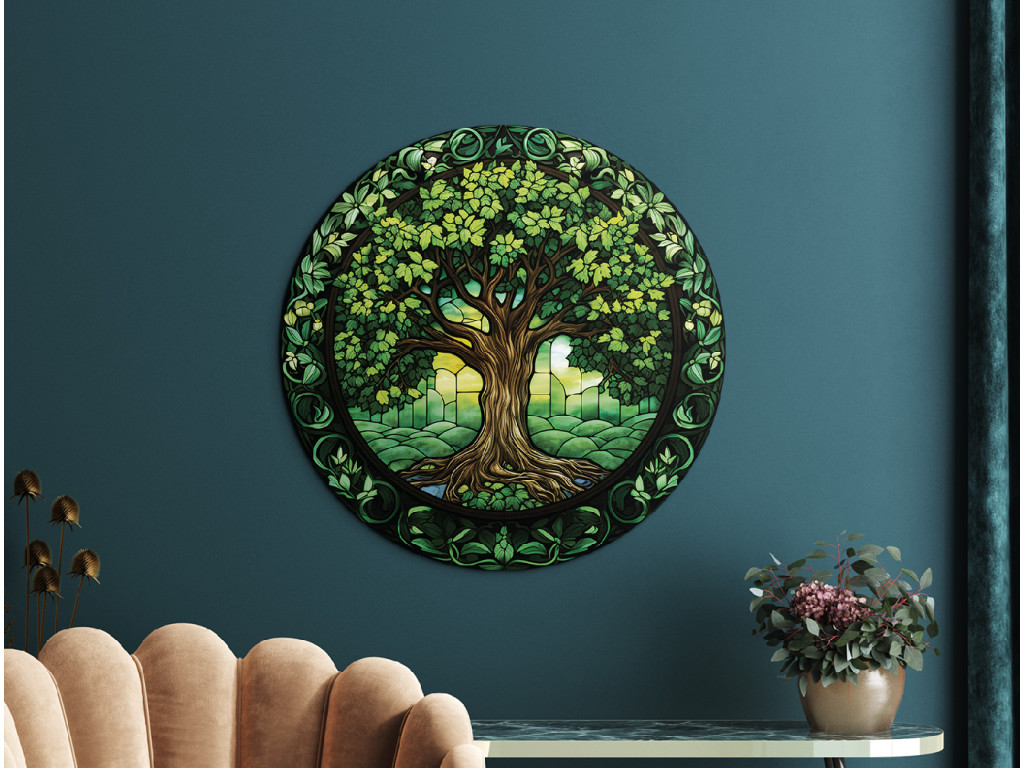 Okrúhly nástenný dekor zobrazuje Strom života v štýle vitráže, s bohato prepletenými keltskými uzlami. Dominujú mu sýte zelené listy a korene, ktoré vytvárajú harmonický kruhový motív okolo hnedého kmeňa. Celý dizajn pôsobí ako symbol rovnováhy, večnosti a prepojenia prírody a ducha.