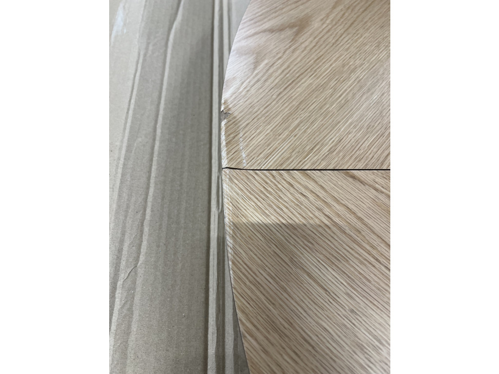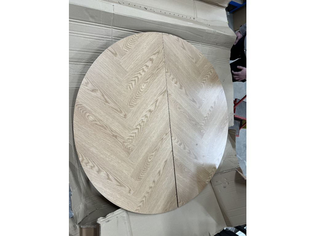 Stôl Georgetown v okrúhlom tvare s možnosťou rozloženia až na 198 cm zaujme dubovou dyhou s rybou kosťou. Čierna kaučuková základňa dotvára industriálny nádych. Perfektný pre rodinné oslavy i bežné večere. Stôl má poškodenie na hlavnej doske a ďalšie menšie škrabance na doske a nohách stola.
