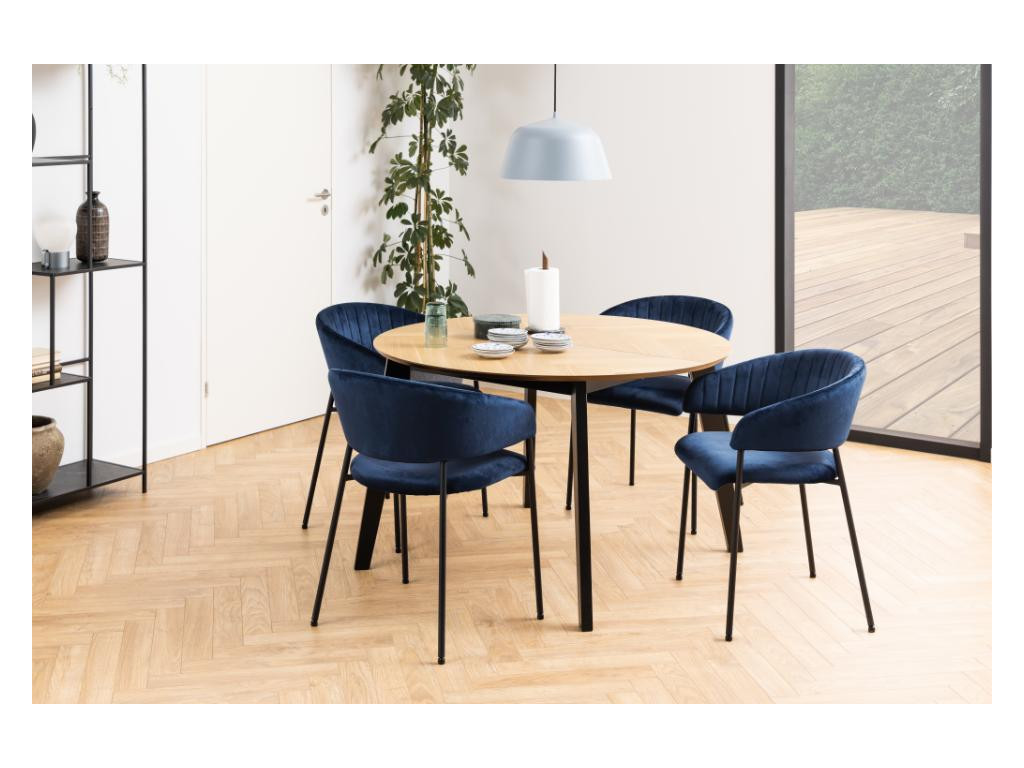 Vyniknite s jedálenským stolom Georgetown, ktorý spája klasiku vzoru rybej kosti s modernou severskou estetikou. Okrúhly tvar je ideálny do menších priestorov a vďaka dvom prídavným doskám jednoducho premeníte stôl na oválny variant až do 198 cm. Čierna lakovaná podnož z masívneho kaučukovníka dodáva stabilitu a kontrast k teplému tónu matného duba.