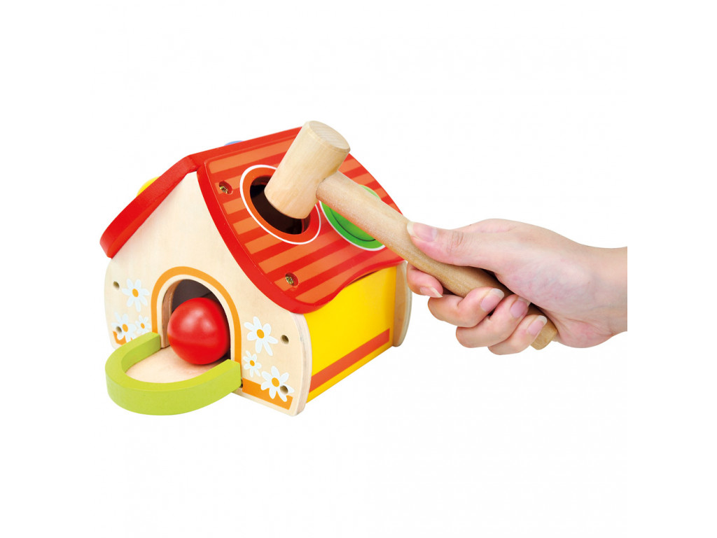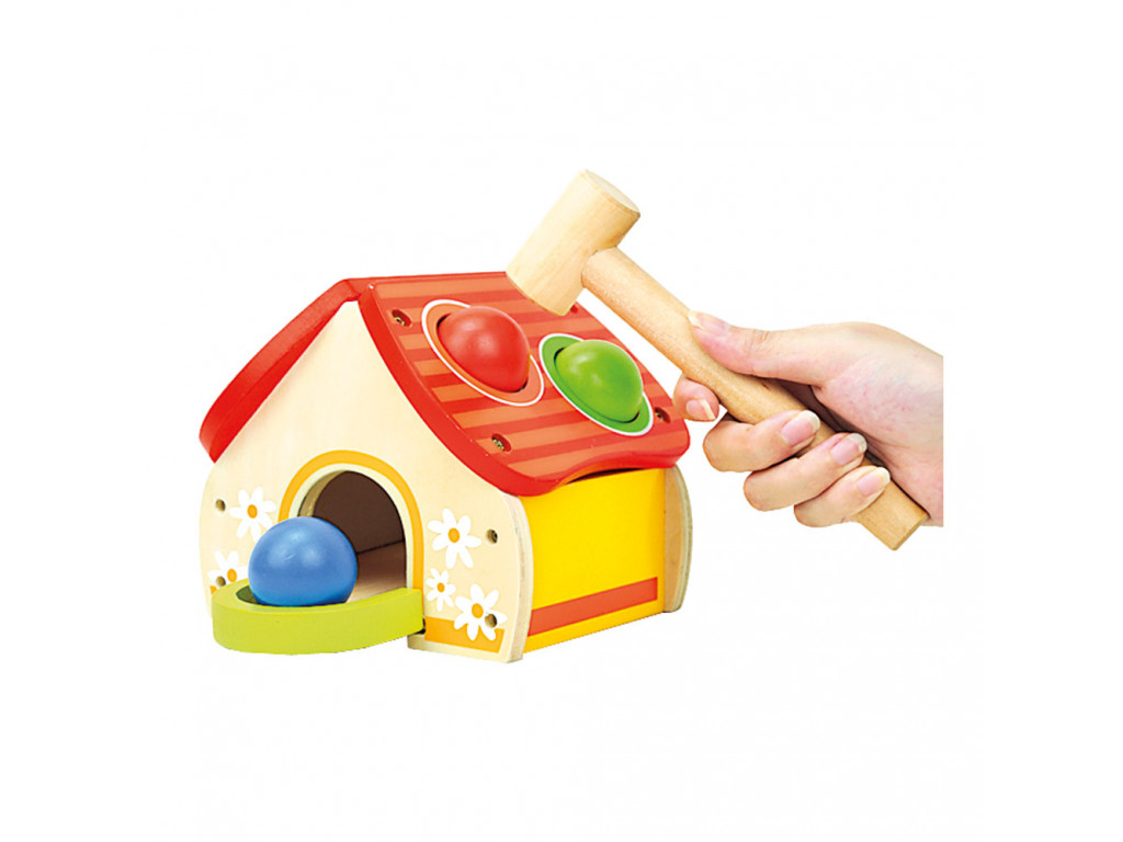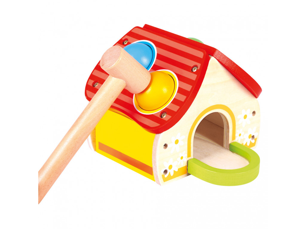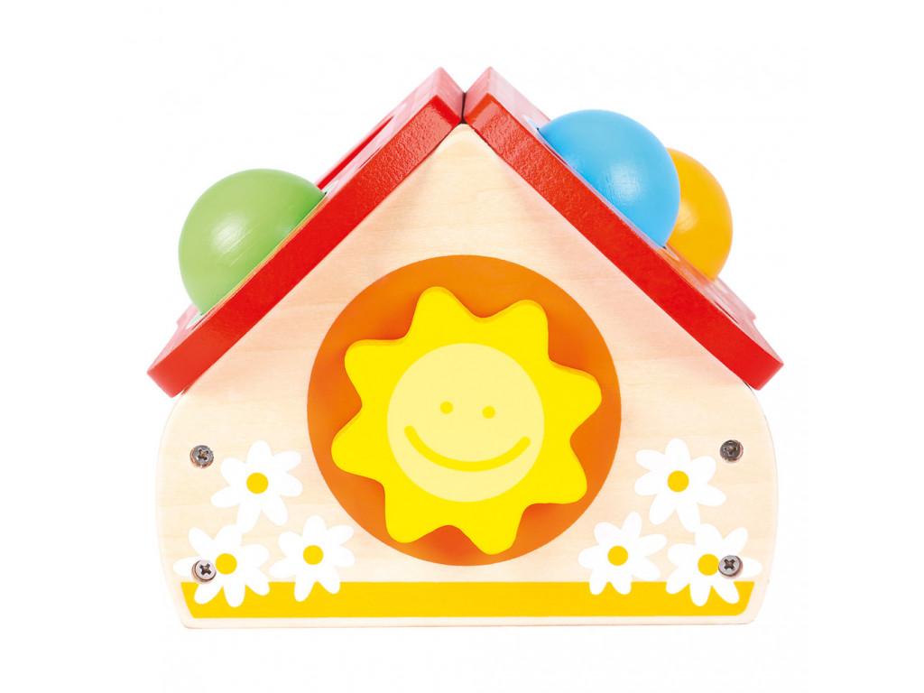 Pestrofarebná zábava! To je zatĺkačka vo forme domčeka s loptičkami. Loptičky poslúžia ako univerzálna hračka a domček sa tiež nestratí pri ďalších hrách, najmä s figúrkami. Zatĺkačka rozvíja koordináciu zraku a pohybu. Hračka je robustná, vyrobená zo silnej preglejky a masívneho dreva.
