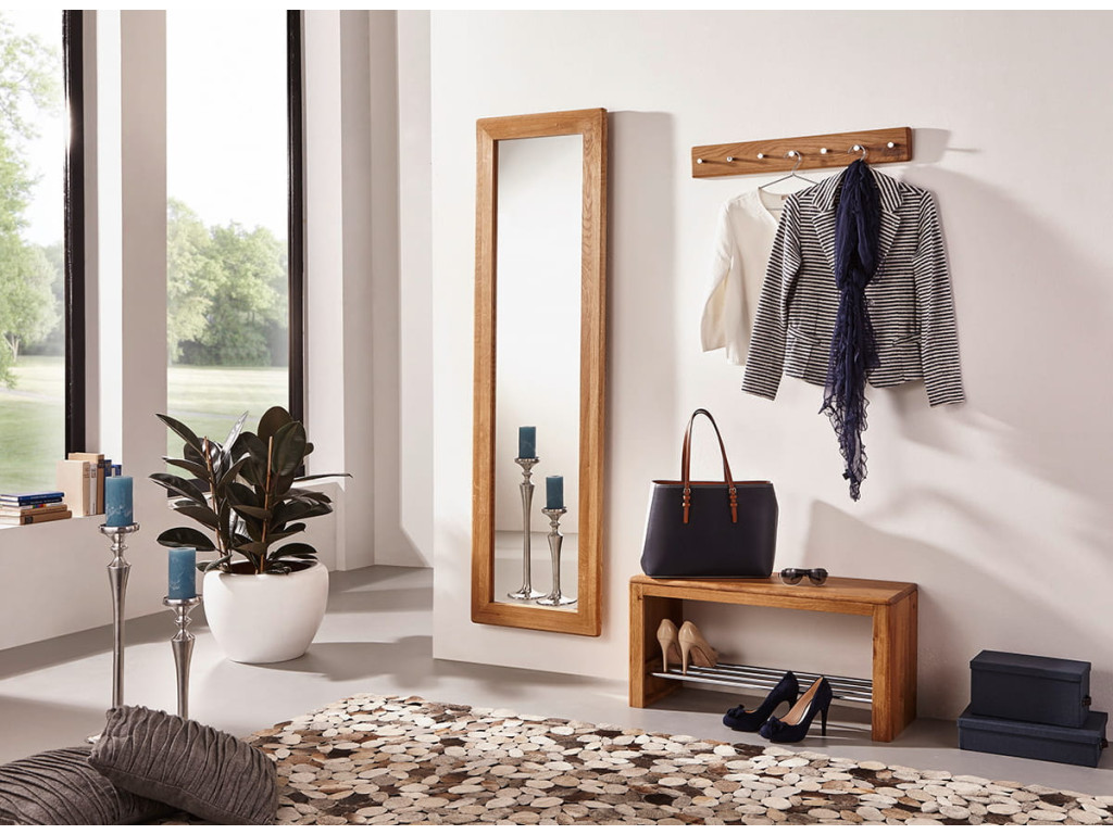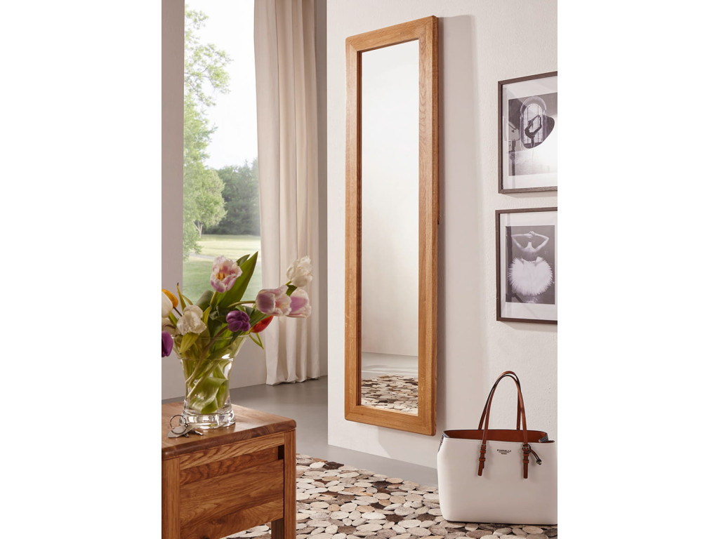 Môžete ho používať vertikálne aj horizontálne. Zaručene si nájde svoje miesto v spálni či v predsieni, ale nepohrdne ním ani prázdna stena v obývačke, alebo jedálni, kde by ho bolo možné zavesiť vodorovne. Veľké zrkadlo je uzavreté v minimalistickom ráme z masívneho dubového dreva vo farbe dub. Tento materiál je zárukou trvanlivosti nábytku a odolnosti voči poškodeniu. Viditeľná štruktúra dreva dodáva nábytku jedinečný charakter.